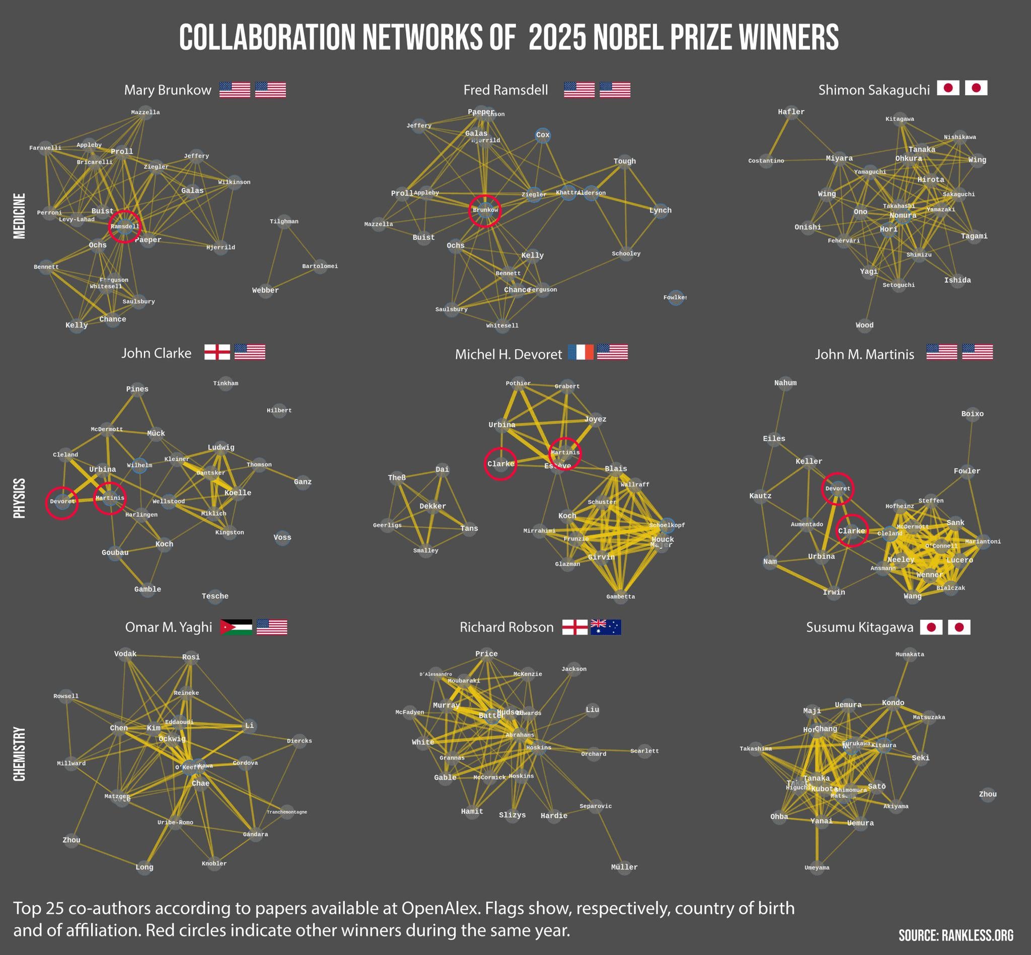 Co-authorship networks of the 2025 Nobel Prize winners in Medicine, Physics, and Chemistry. The visualizations come from their profile pages in https://www.rankless.org/, a platform to visually explore academic impact built on OpenAlex data.