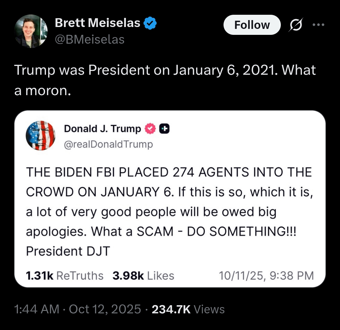 So, he’s saying he pardoned bidens fbi agents? I hope as his brain turns to more mush that he starts rattling off the inner workings of the trump epstein pedo ring and blames it on someone not involved like Obama or fauci.