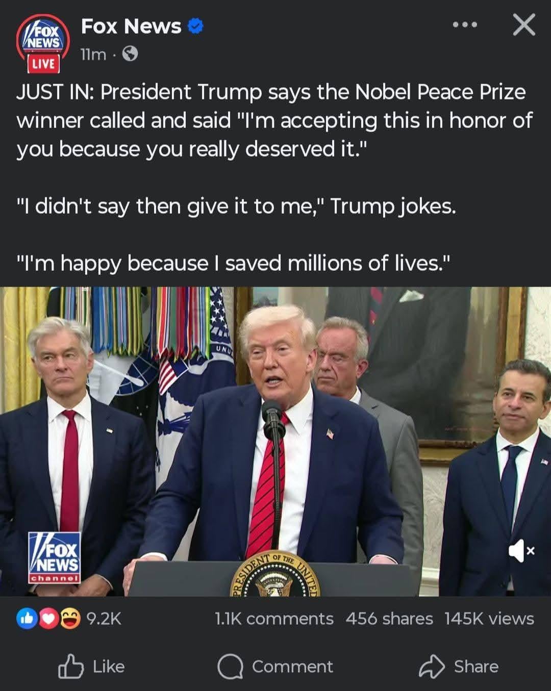 We should all convince him that if he releases the Epstein Files then he will win a Nobel.