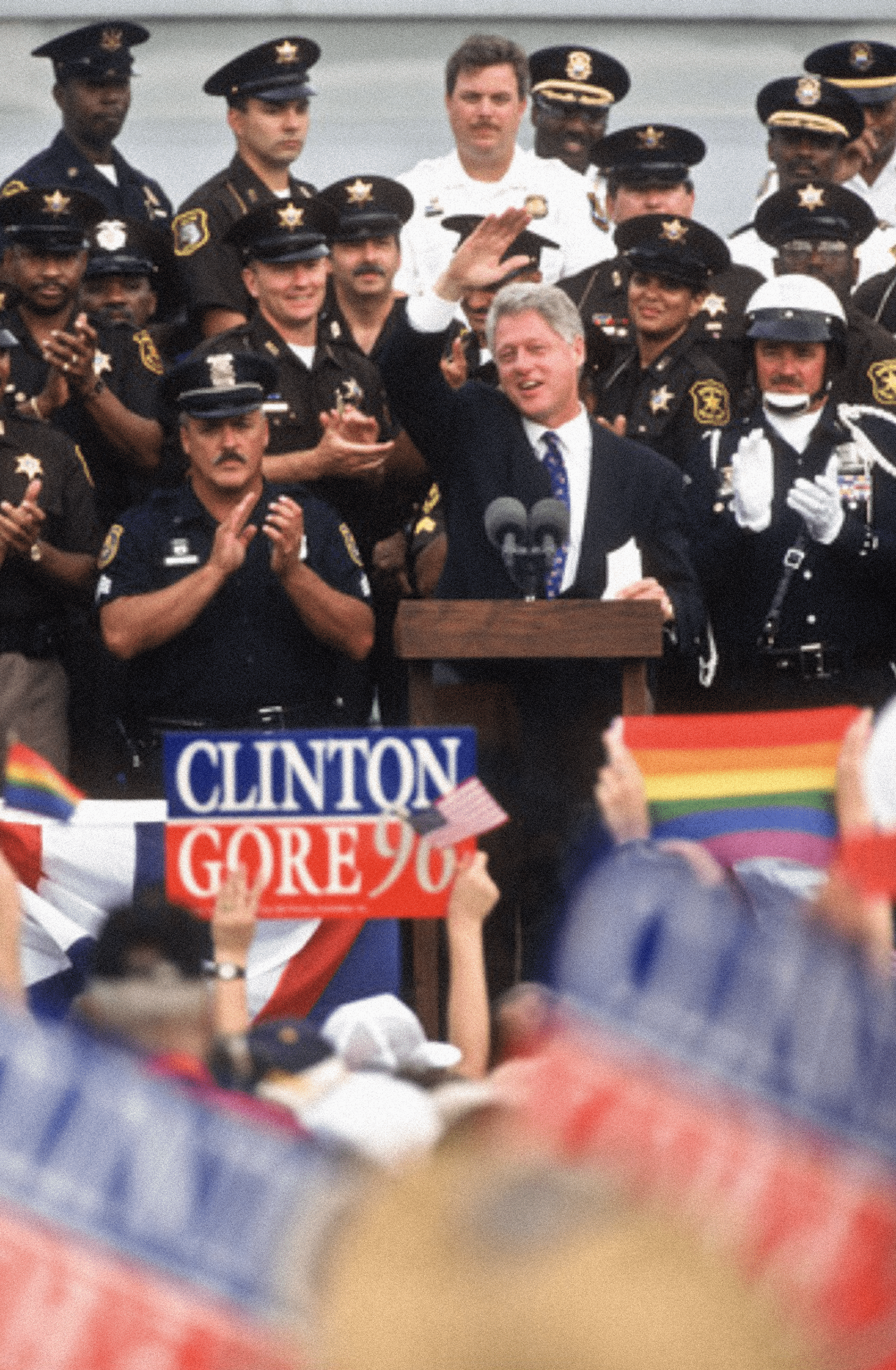 U.S. President Bill Clinton holds a rally with law enforcement officers on a campaign stop touting his criminal justice reforms. Michigan, 1996. [1888×2888]