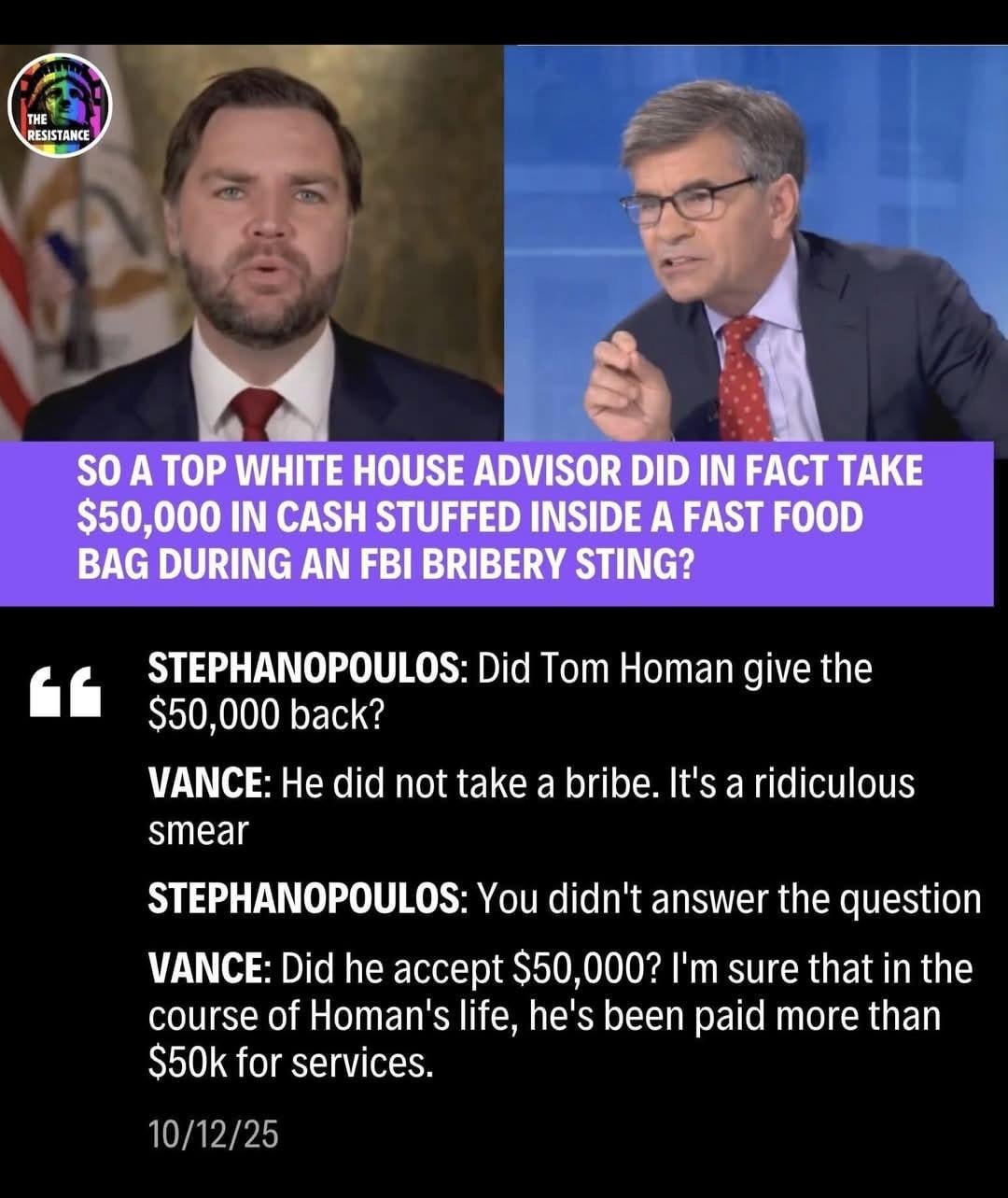 ElusoryLamb on October 12, 2025 9:36 pm What needs to be said: If you don’t unequivocally say Homan didn’t accept a bribe to the best of your knowledge, I’m going to assume that you are saying he did take a bribe.
