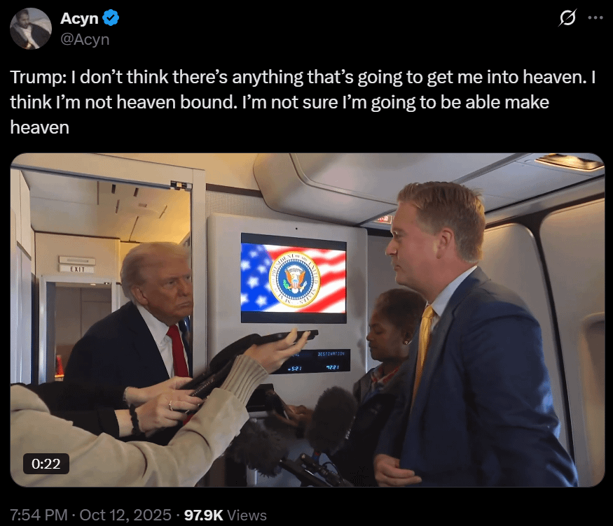 Pope just called. Says he can offer a Heaven pass if Trump releases the Epstein Files today. Limited time offer.