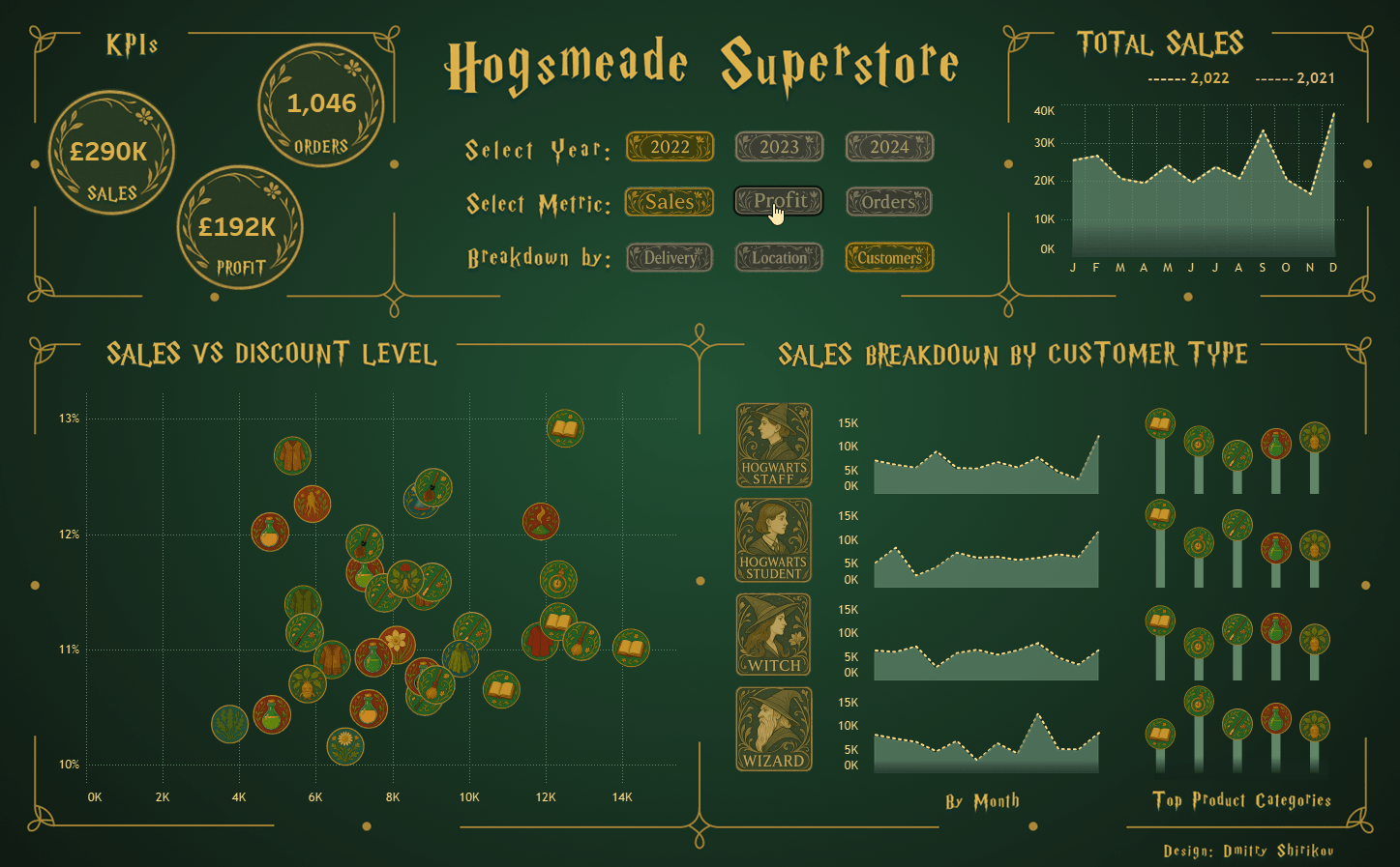top_dog_god_pot on October 13, 2025 6:54 am As a huge Harry Potter fan, I couldn’t resist imagining what it would look like if a witch or a wizard wanted to track their business performance in the magical world. Link to this interactive viz:  [https://public.tableau.com/app/profile/dmitry.shirikov/viz/HogsmeadeSuperstore/Dashboard](https://public.tableau.com/app/profile/dmitry.shirikov/viz/HogsmeadeSuperstore/Dashboard) Data: Faker Library Icons and background: ChatGPT and custom designs in Figma. Tools used: Tableau Public