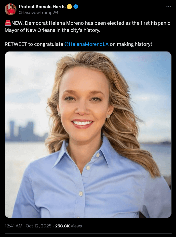 Democrat Helena Moreno has been elected as the first hispanic Mayor of New Orleans in the city’s history. by CapAccomplished8072