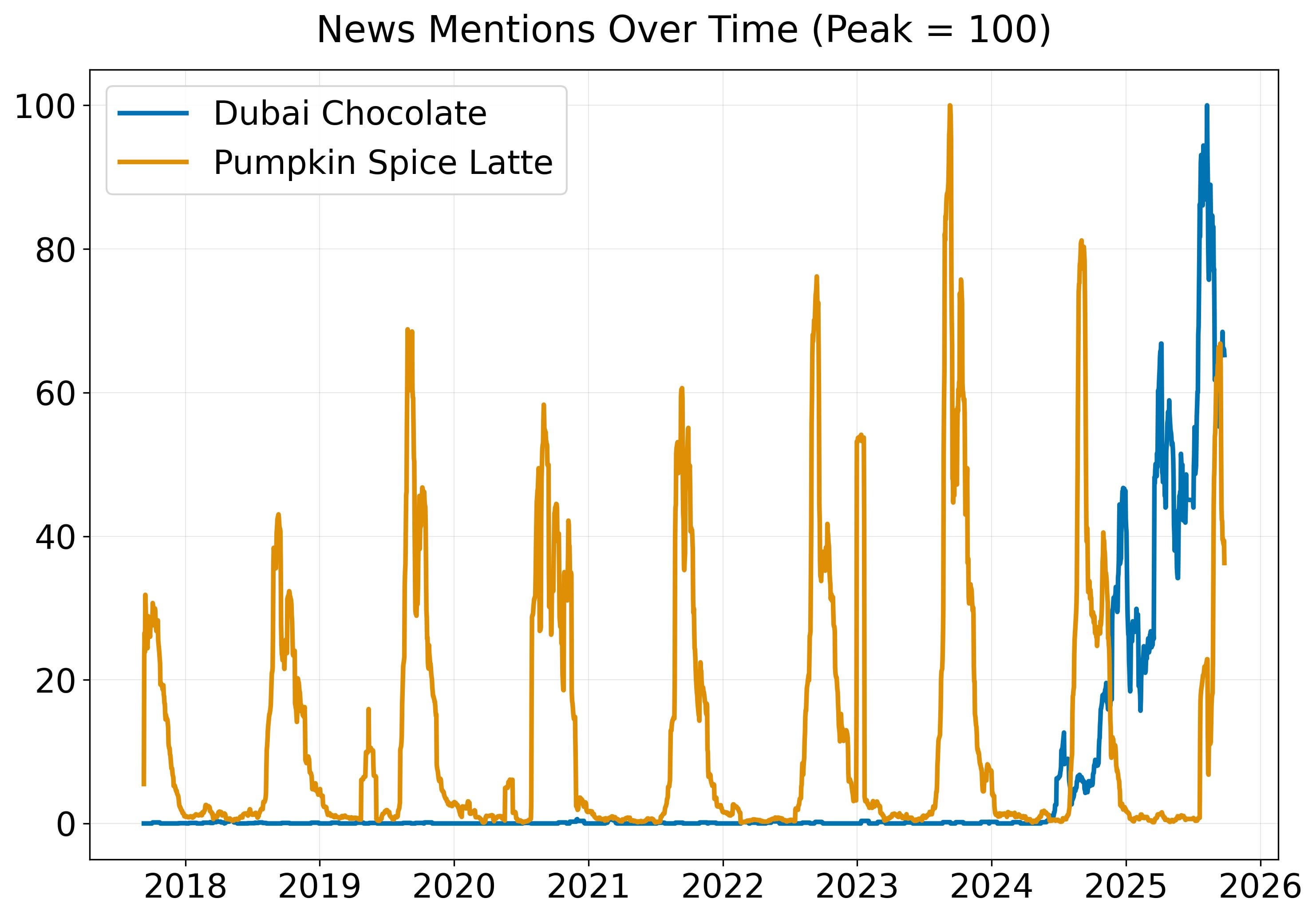 Using GDELT, a database that tracks more than 100,000 online news sources in over 100 languages and processes about 250 million articles each year, I pulled daily article counts of how often each was mentioned between 2017 and 2025. The counts are indexed to 100 = maximum mentions.