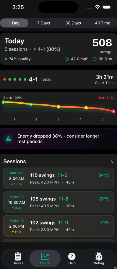 Data source: Personal pickleball activity tracked via PickleWatch app (iOS/Apple Watch)