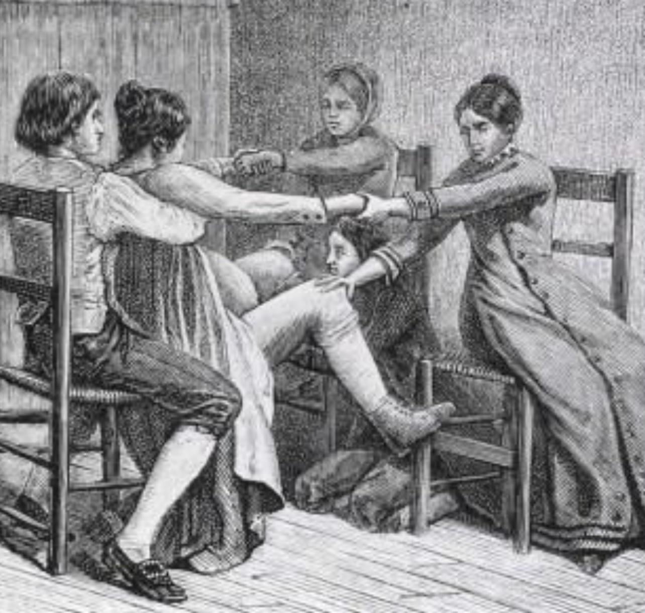 Engraving titled “Pioneer Birth Scene Of Two Women” from around the 1800s. The scene depicts a childbirth with four women present, likely a midwife and assistants, helping a woman in labor. The image is an illustration from the book “History Of Birth Of All Peoples” published 1887