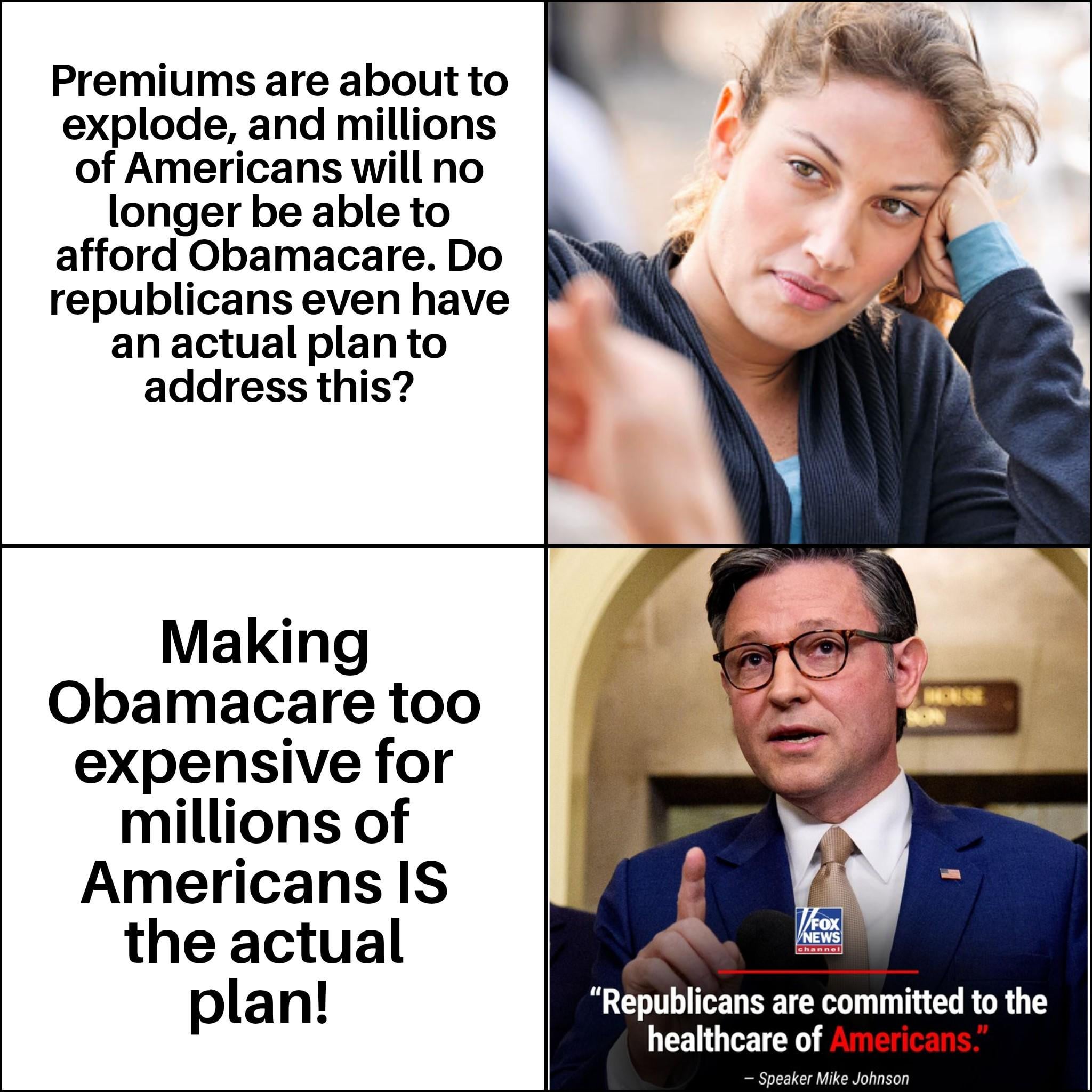 Republicans then won the house, removed the “risk corridor” which was a pool of money to split up in case any of the insurance companies happened to get a lot of old sick people. Once that got fucked up, insurance companies started leaving the exchange, or doing things like denying the same doctors the people had previously. etc.