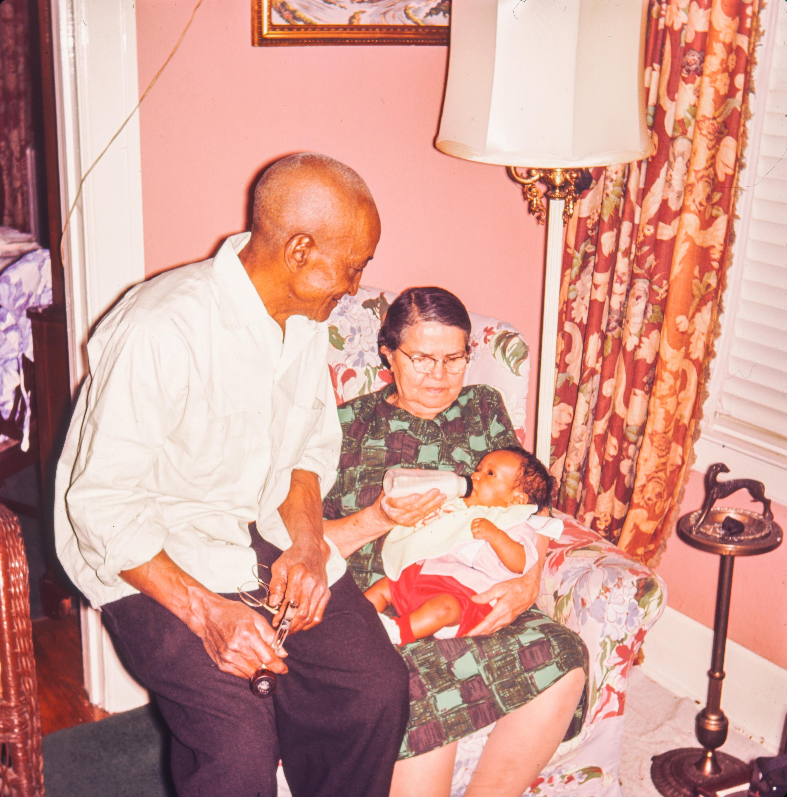 2 grandpas feed a little baby while sitting on the armchair, September of 1963. Kodachrome sho. by Electrical-Aspect-13