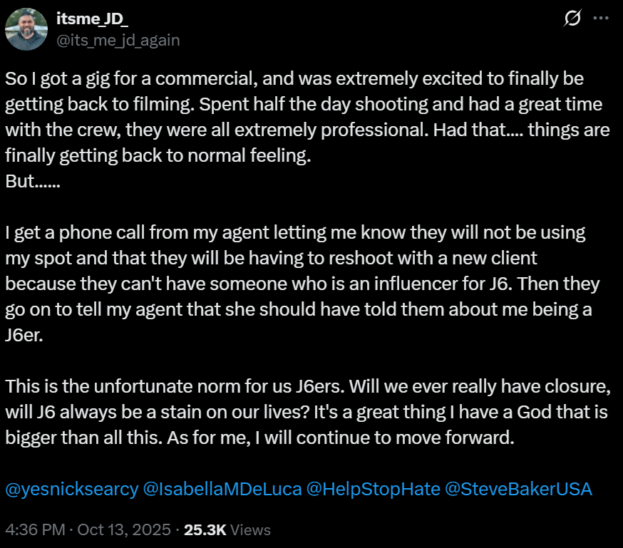 Oh geez what a victim. What is this country coming to when even somebody who joined in a violent (poorly) attempted takeover of the US government can’t get a job?
