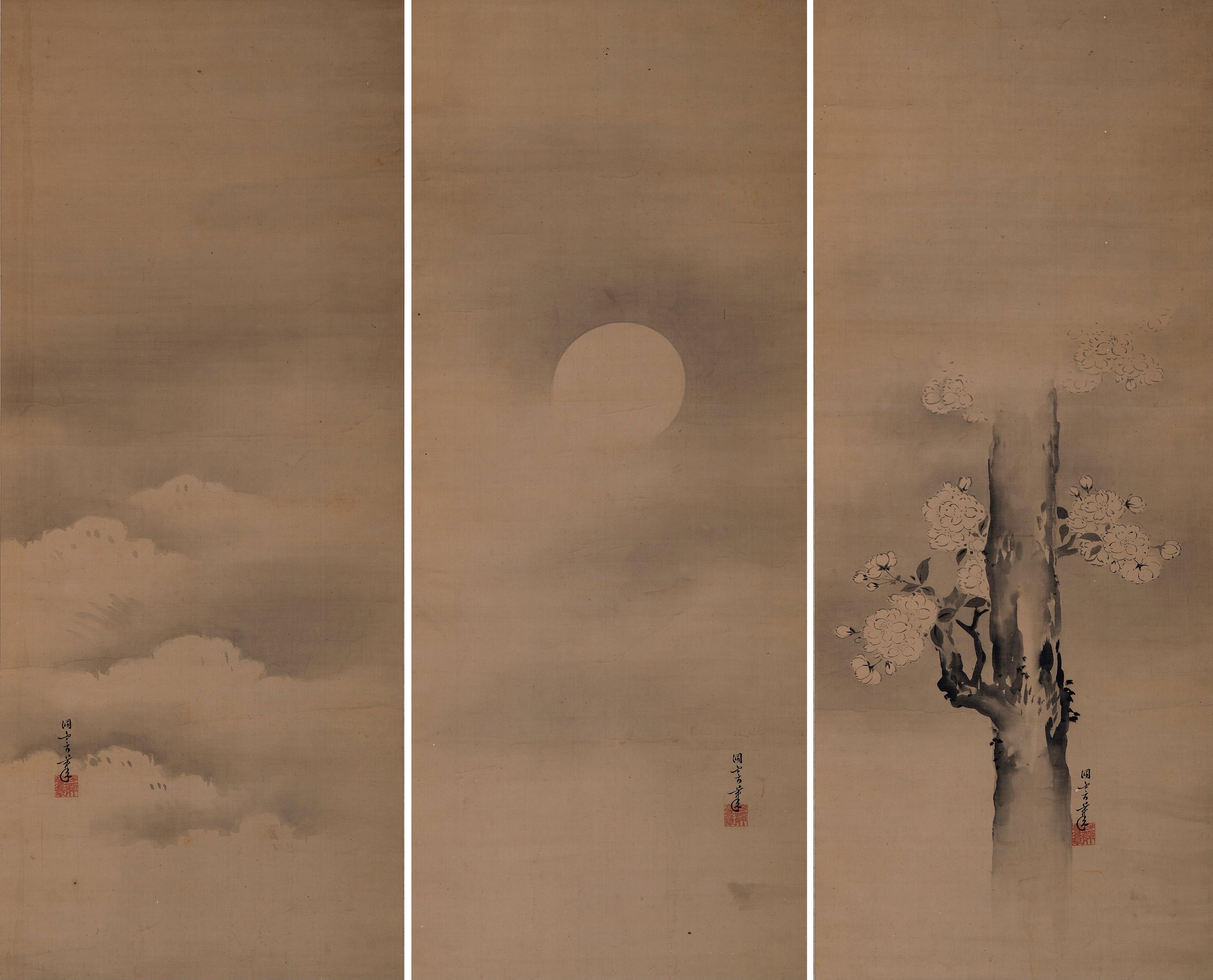 Snow, Moon, and Flower. Three silk paintings by Kanō Masunobu. Japan, Edo period, 17th century [4700×3800] by MunakataSennin