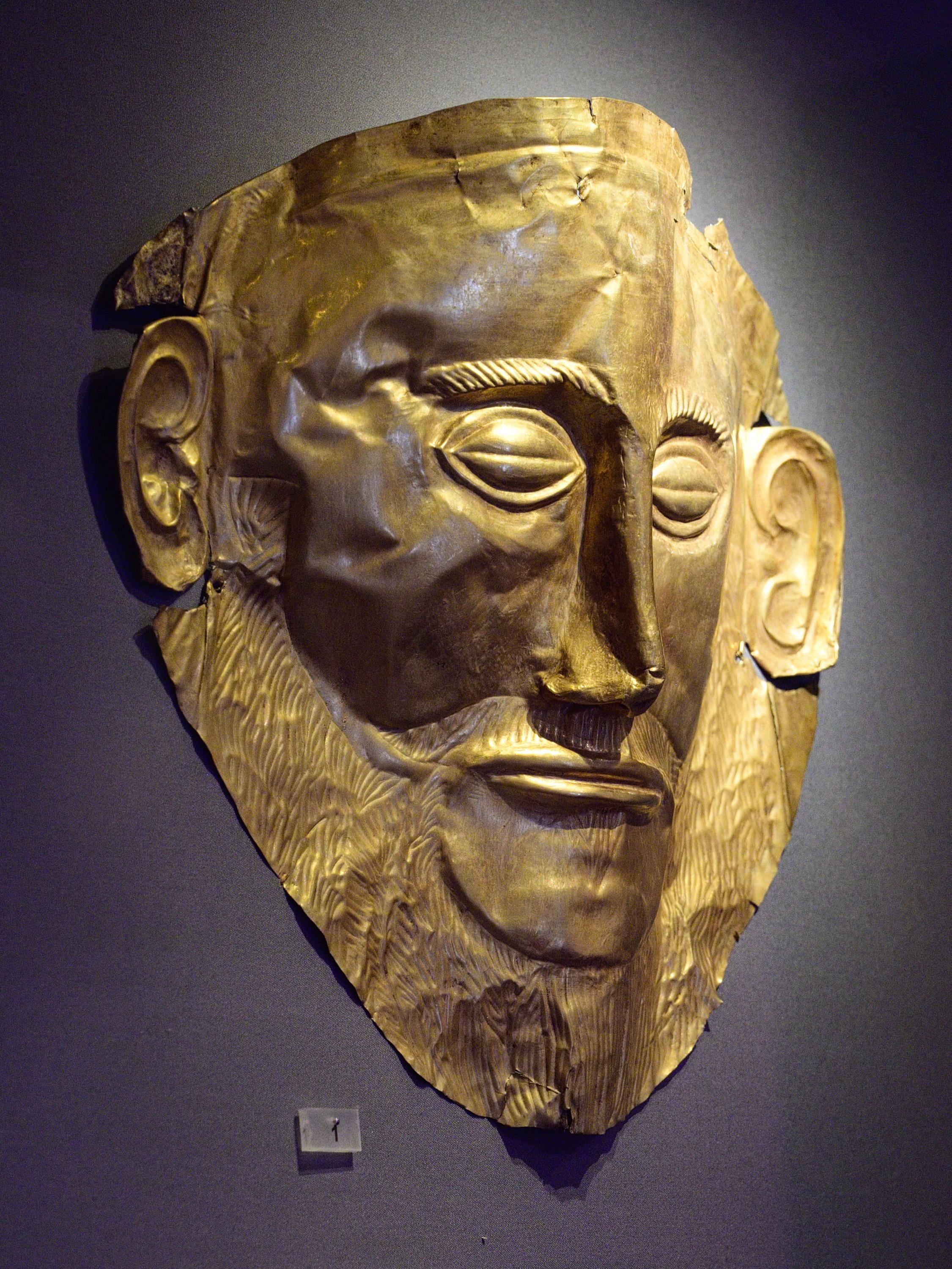 “Mask of Agamemnon” (Mycenaean funerary mask) — Mycenaean; Date: 16th c. BCE; Findspot: Grave V, Grave Circle A, Mycenae; Medium: gold sheet (repoussé); Approx. H.: 35 cm; Collection: National Archaeological Museum, Athens (NAMA 624). Photographer: Zde / Wikimedia Commons [2251 X 3000]
