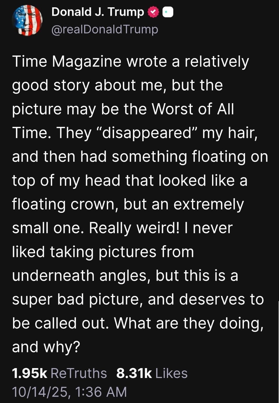 My brother in Christ, you’re still on the front of Time magazine. We all know you look like shit and this is *exactly* the photo you deserve.