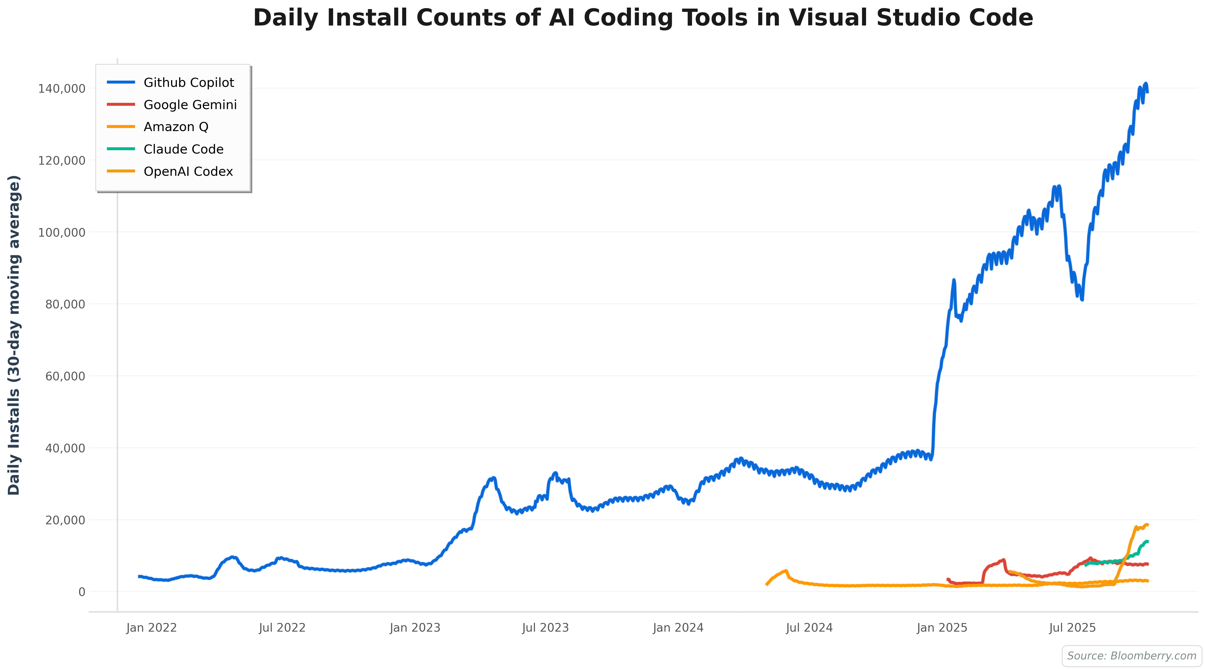 Would’ve figured Claude Code would be more popular, leagues above Copilot in my experience, but suppose it is paid and it’s still early days for the extension.