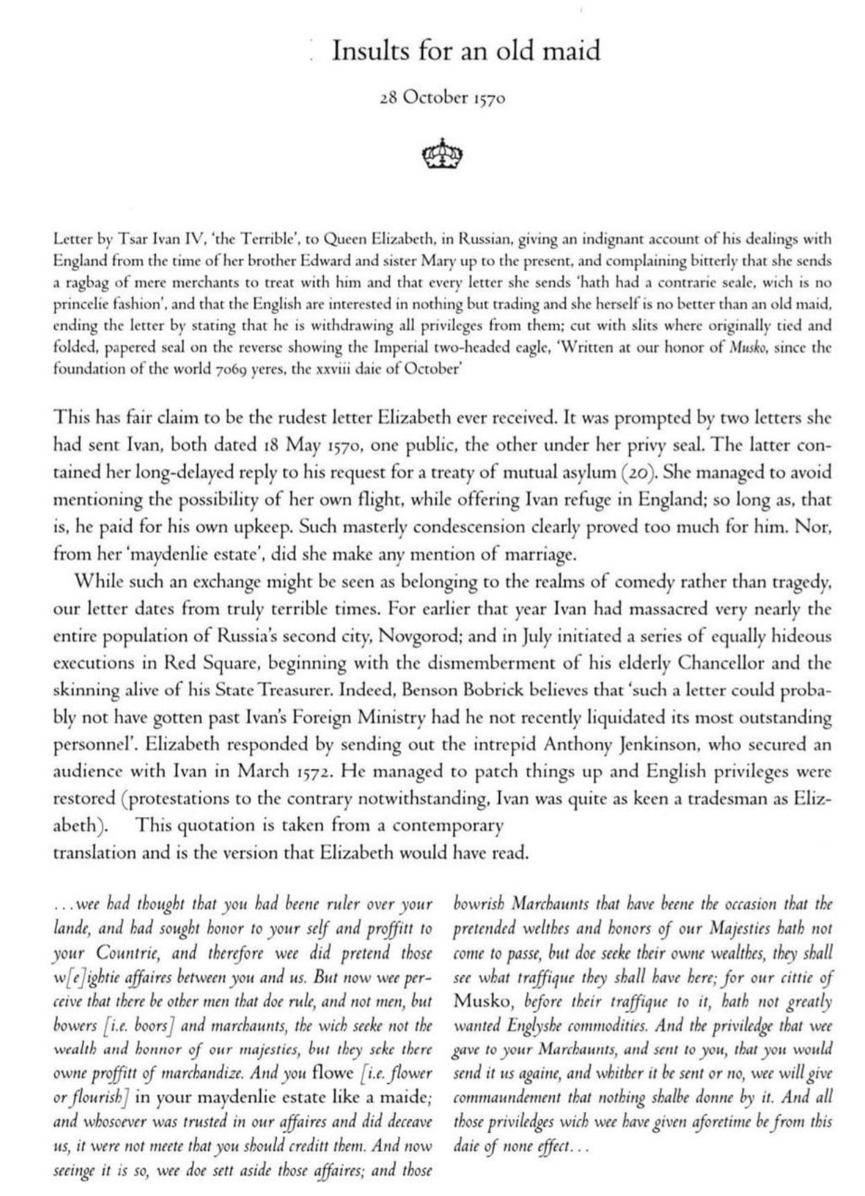 In 1570 Russian ruler Ivan The Terrible decided he wanted to Take Asylum in Britain and Queen Elizabeth I basically said he could come if he wanted but he would be on his own.He then got very Salty and Affronted and Sent a barely literate ranting letter to her[1284×1676]