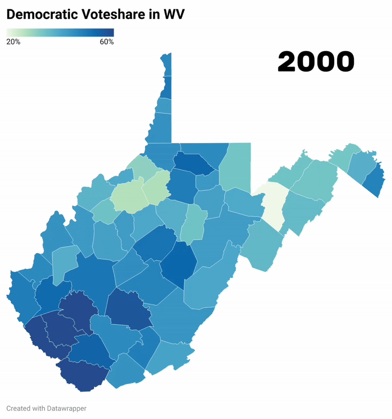 (For sources go here: https://en.wikipedia.org/wiki/United_States_presidential_elections_in_West_Virginia you can click on individual elections and see how counties voted.) Just a little project I decided to do. I expected the rural vote to have died out in 2008 but it took until 2016 for that to happen. in 2020 Biden seems to have performed a little better in some rural areas. PLEASE do not argue about politics, I’m just a nerd who likes to look at political data.