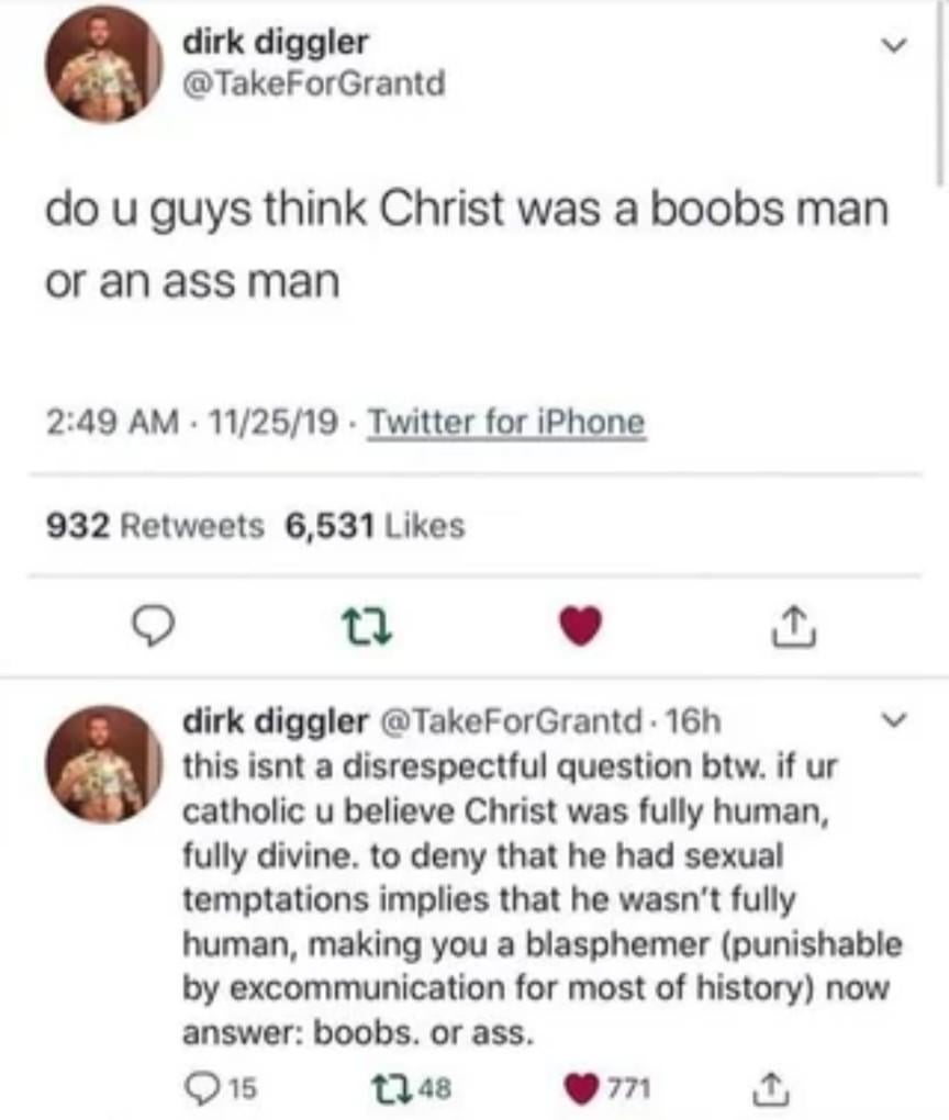 The fascination with breasts likely stems from an evolutionary perspective, where humans sought sustenance from their mothers’ milk during infancy, fostering a deep-seated cultural and biological appreciation. However, considering Jesus’ immaculate conception, he may not have developed a typical reliance on or taste for milk, potentially shifting any hypothetical preference. Based on this reasoning, one might speculate a lean toward Jesus having an appreciation of ass over boobs.