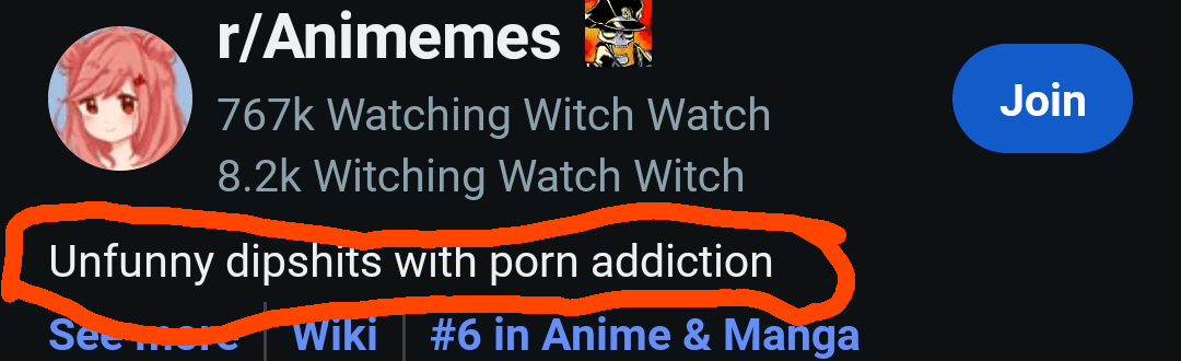 Gold-Bard-Hue on October 14, 2025 5:55 pm Porn addiction ☑️ Dipshits ☑️ Unfunny 🚫 Redditors have some of the funniest follow-up comments I ever see/hear. Some dare insult their waifus though, that’s just asking for trouble. Now them *having* a sense of humor about themselves? 🚫