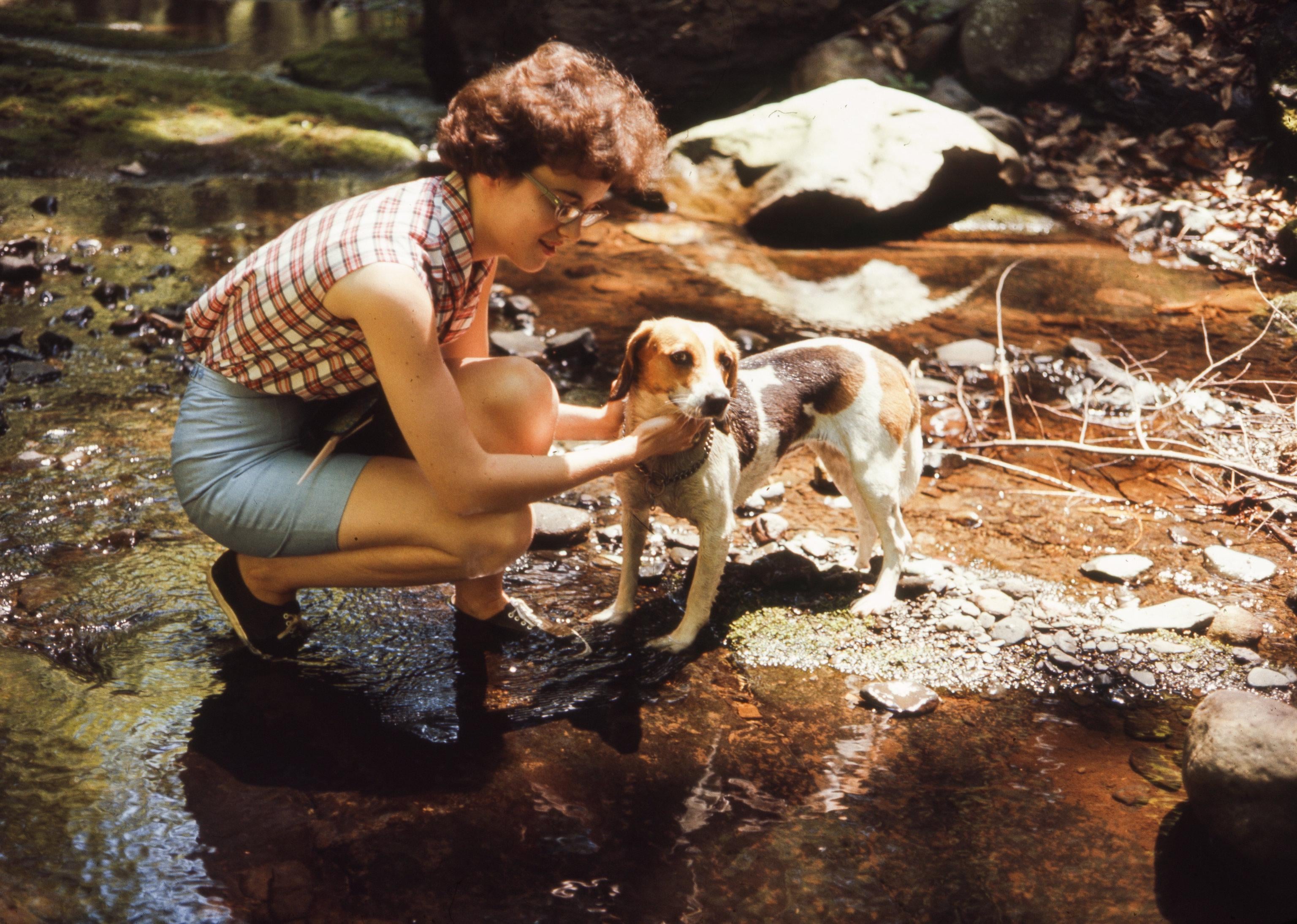 Young redhead lady cares her little friend close while they are at the creek, July of 1965, 60 years ago. by Electrical-Aspect-13