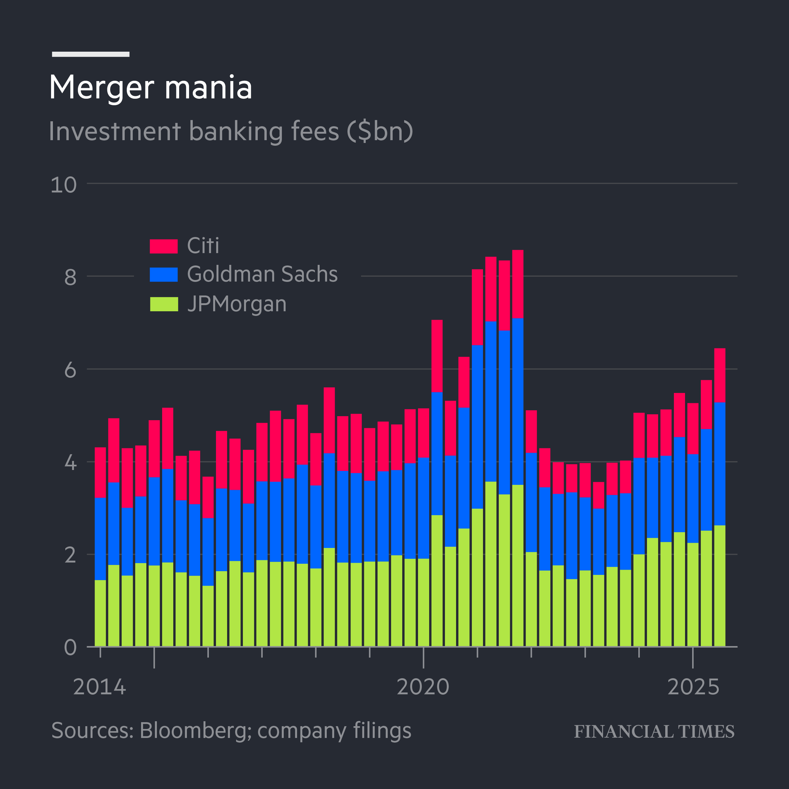 M&A is booming, with companies globally striking $1tn of deals in the third quarter, one of the busiest in history. As a result, JPMorgan Chase, Citigroup and Goldman Sachs collectively pulled in about $6.5bn in advisory work and equity and debt underwriting fees, 25% more than a year ago.
