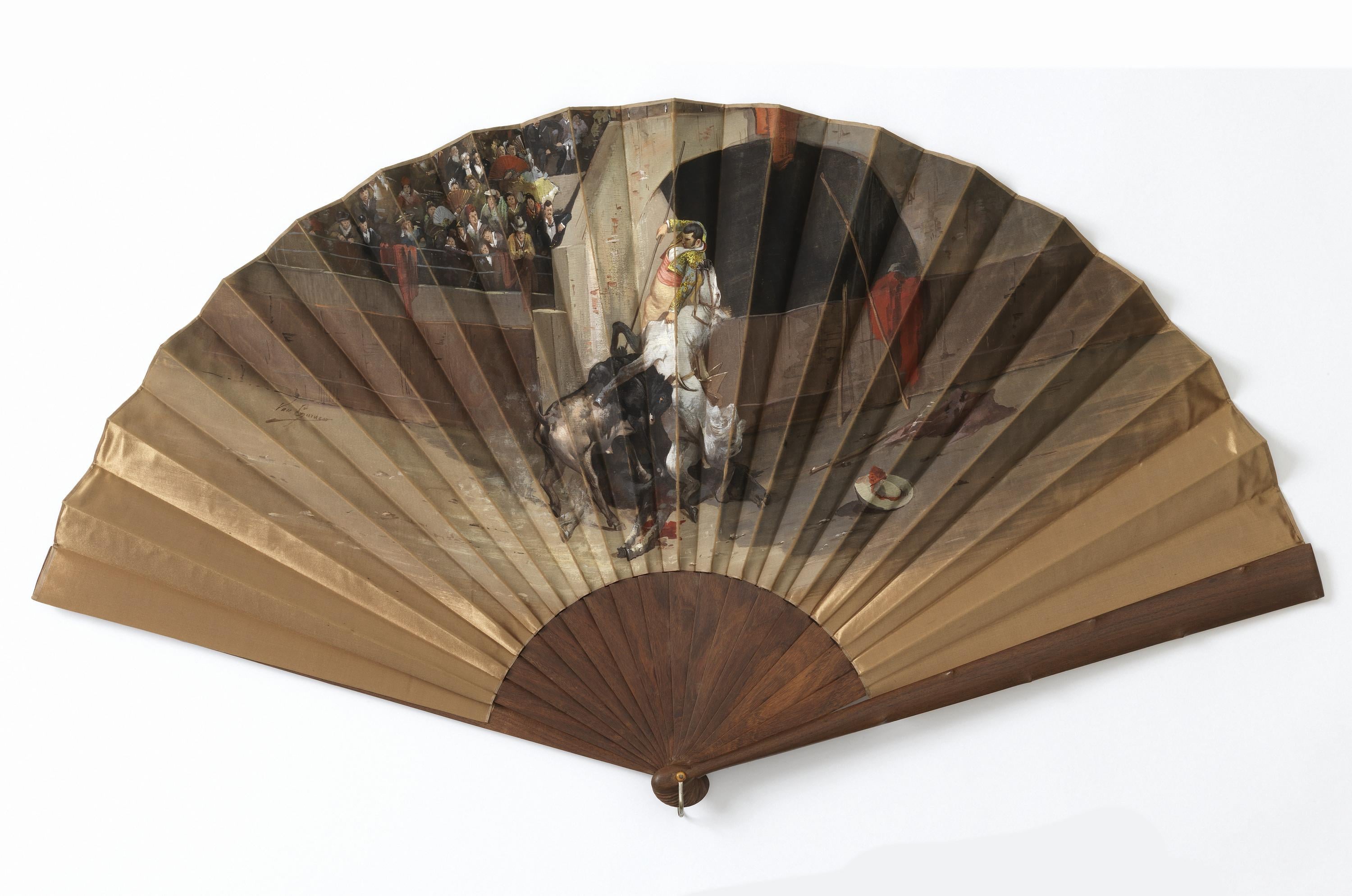 Pleated fan made of silk and wood featuring a painting of a bull fight, Spanish, c. 1850-1900. [3000×1988] by chubachus