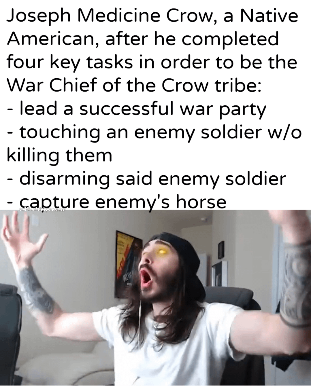 The thing that is both badass and simultaneously infuriating is that the horse rule remains in place afaik. A later warrior of the same tribe fighting for the US in Vietnam was snubbed of the title because he couldn’t steal a horse.