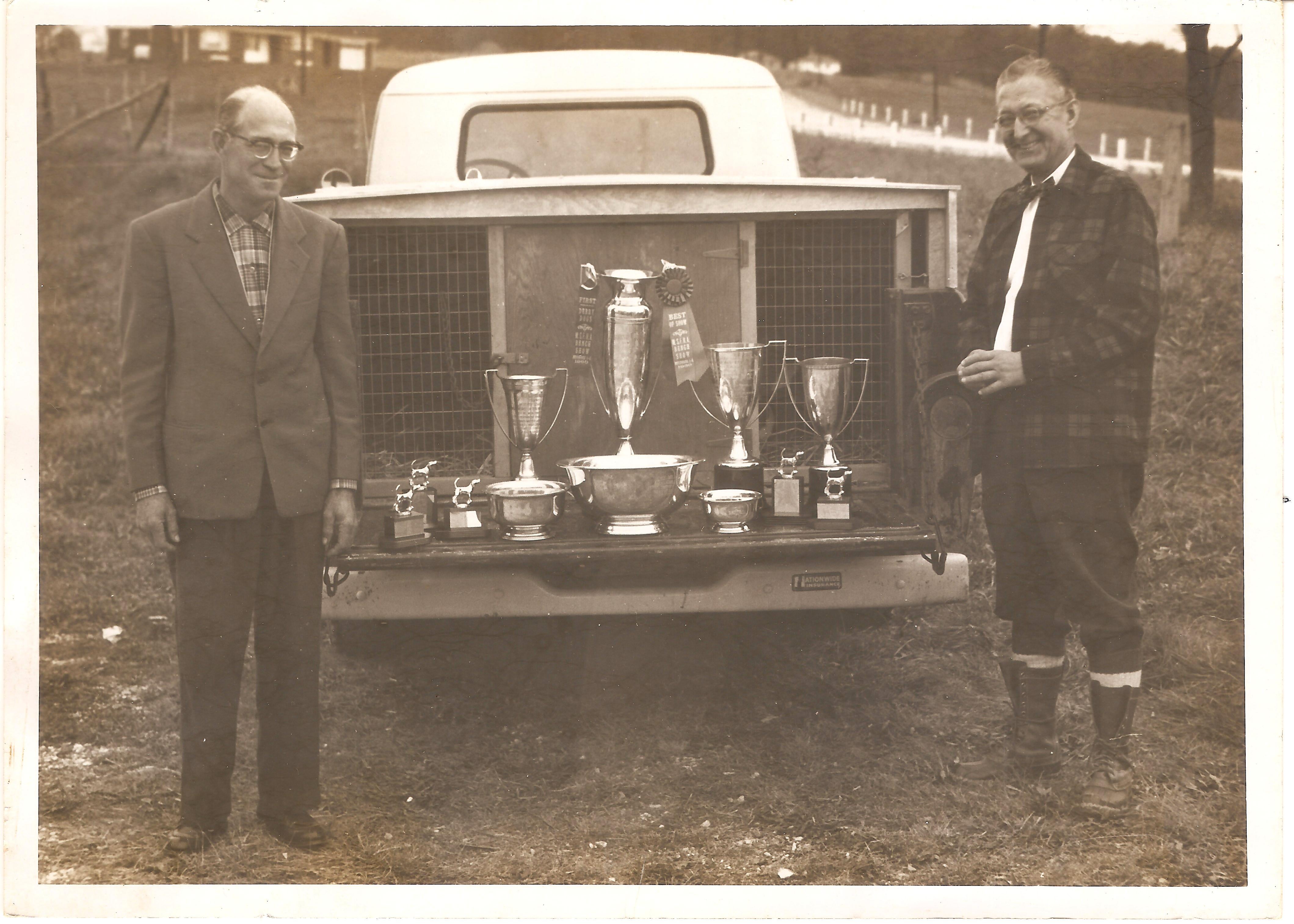 My great uncle, on right, cleans up at a dog show. He did just as well with his horses. 1950s, Maryland. by dickwae
