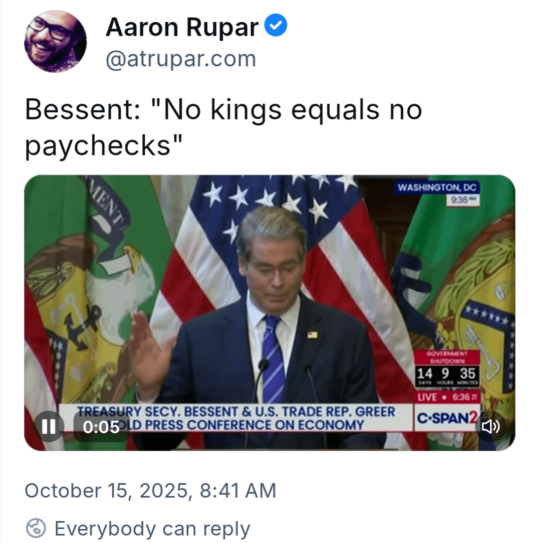We really went from “No taxation without representation” to “no kings equals no paychecks”