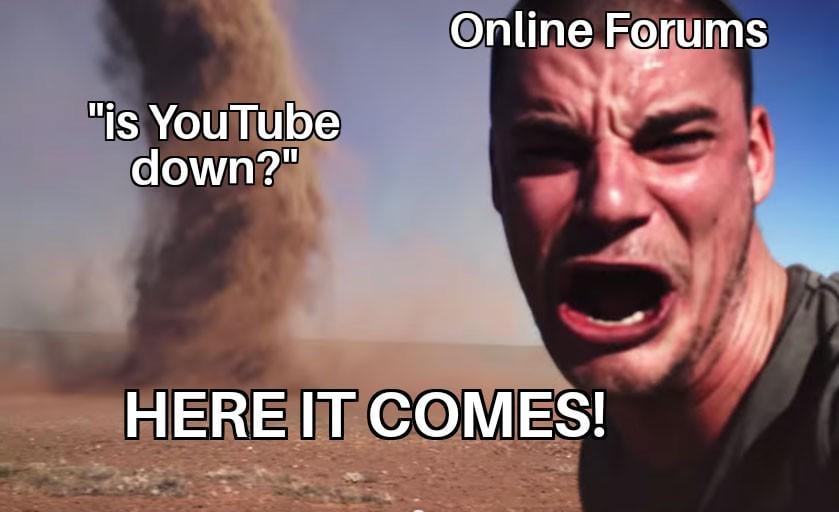 Apprehensive_Reach37 on October 16, 2025 12:19 am Honestly, only reason I’m browsing Reddit right now is because I couldn’t watch anything on YouTube due to it being down