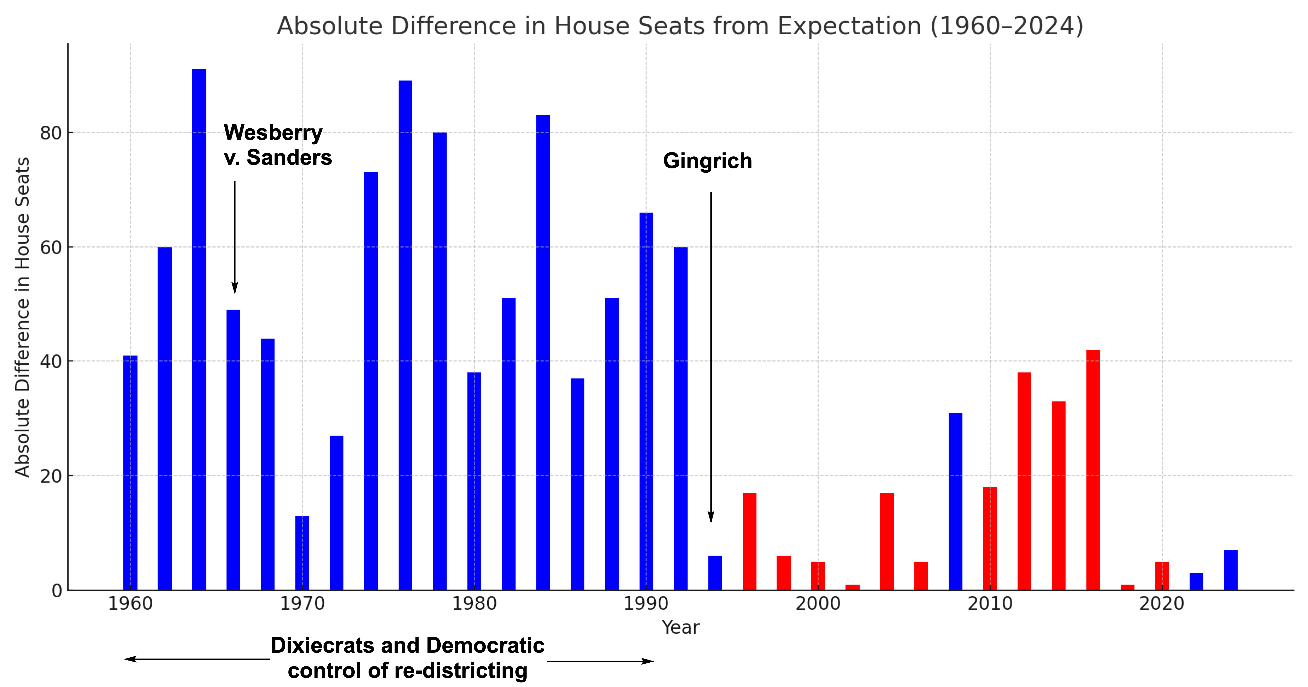 I understand there is a lot to unpack with this graph, but with redistricting in the news and the pending Supreme Court case I was curious to look at imbalances in representation in the House based on raw votes. I realize that the data are masking state-by-state contributions. I didn't know that until Wesberry v. Sanders that "one person, one vote" became law meaning that congressional districts could have wildly different populations. The data were taken from Wikipedia results from each election year.