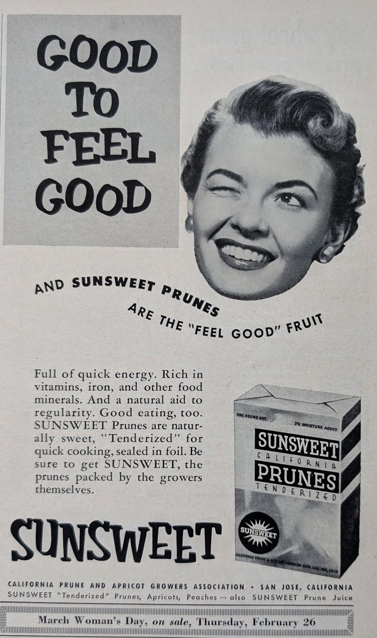 Sun Sweet Prunes The feel good fruit. Woman’s Day February 1953
