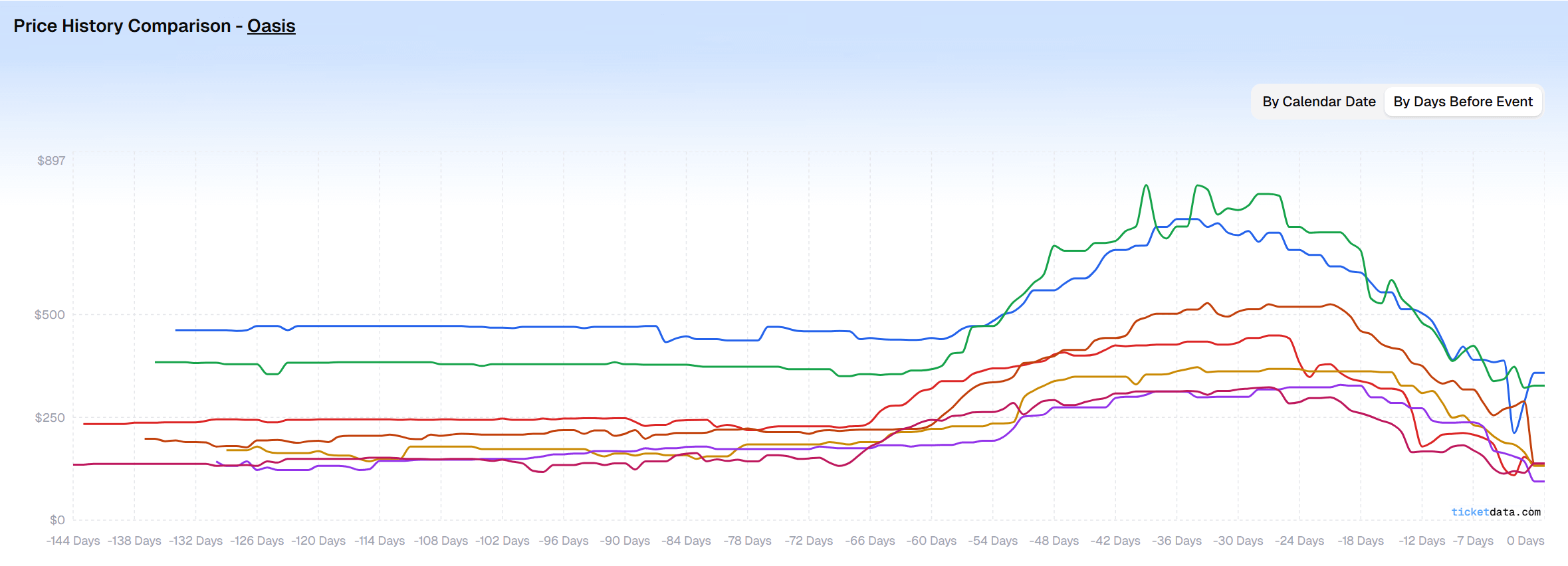 Data source: resale listings tracked through my own long-term project, TicketData (ticketdata.com), which tracks/records listing prices from major resale sites (think StubHub, Vivid Seats, SeatGeek, etc.) and charts how prices change over time.