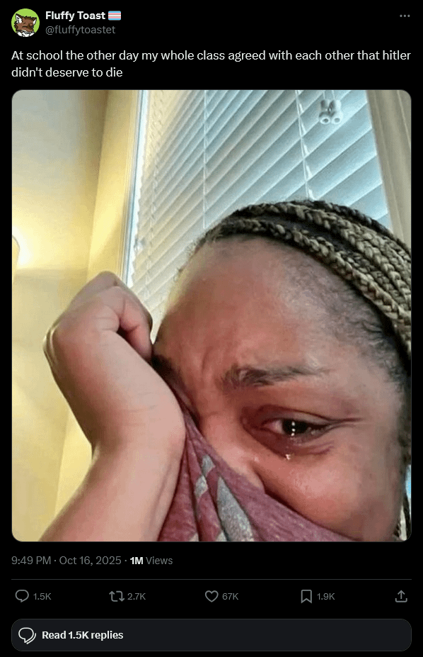 That’s when you heartily laugh in these stupid, brainrotted kids’ faces and say *Well, kids, cry about it all you want, but clearly Hitler didn’t even agree with you*. Then make ’em full on watch the heaviest, hardest documentaries on the Holocaust. They whine about it, you rewind the video and make ’em watch it again. They make a sound, you roll back. Give em an assignment that starts with something like “the Third Reich decided you are an undesirable/not Aryan enough, how do you intend to try and survive?” (Feel free to use various aspects of those kids’ apperances/name/disability status directly. Little Johnny, who thinks Hitler had it rough has ADHD… time to enlighten Johnny on where HE’D end up).
