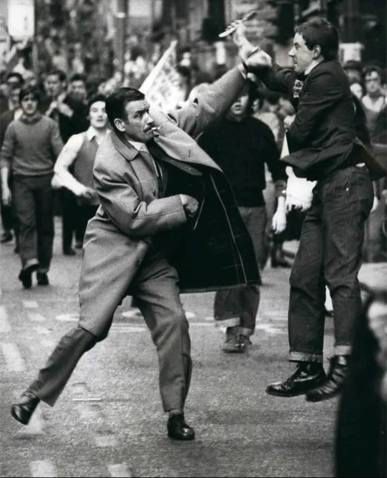 A dapper looking undercover detective disarms a man with a razor who attacked protest marchers during an Irish solidarity parade, Glasgow, Scotland, 1971