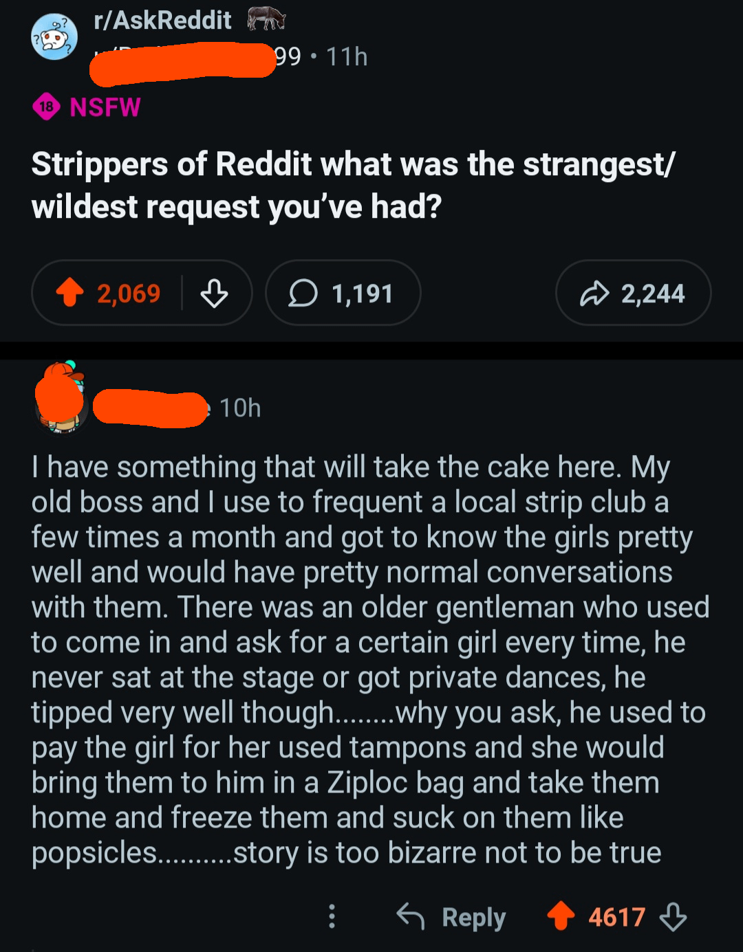 I worked as a DJ at a strip club, We had a glass coffee table upstairs and one bouncer who would pay the girls REALLY well to Shit or Piss on the coffee table while he laid under it and watched, bonus money if they were ragging.