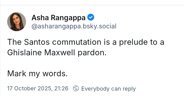 dropkickninja on October 18, 2025 1:58 pm I hope he does pardon her. You can’t unpardon someone. So she can expose everybody after she gets her literal get out of jail free card. Not that she’s one to be inclined to do so but it’s a possibility