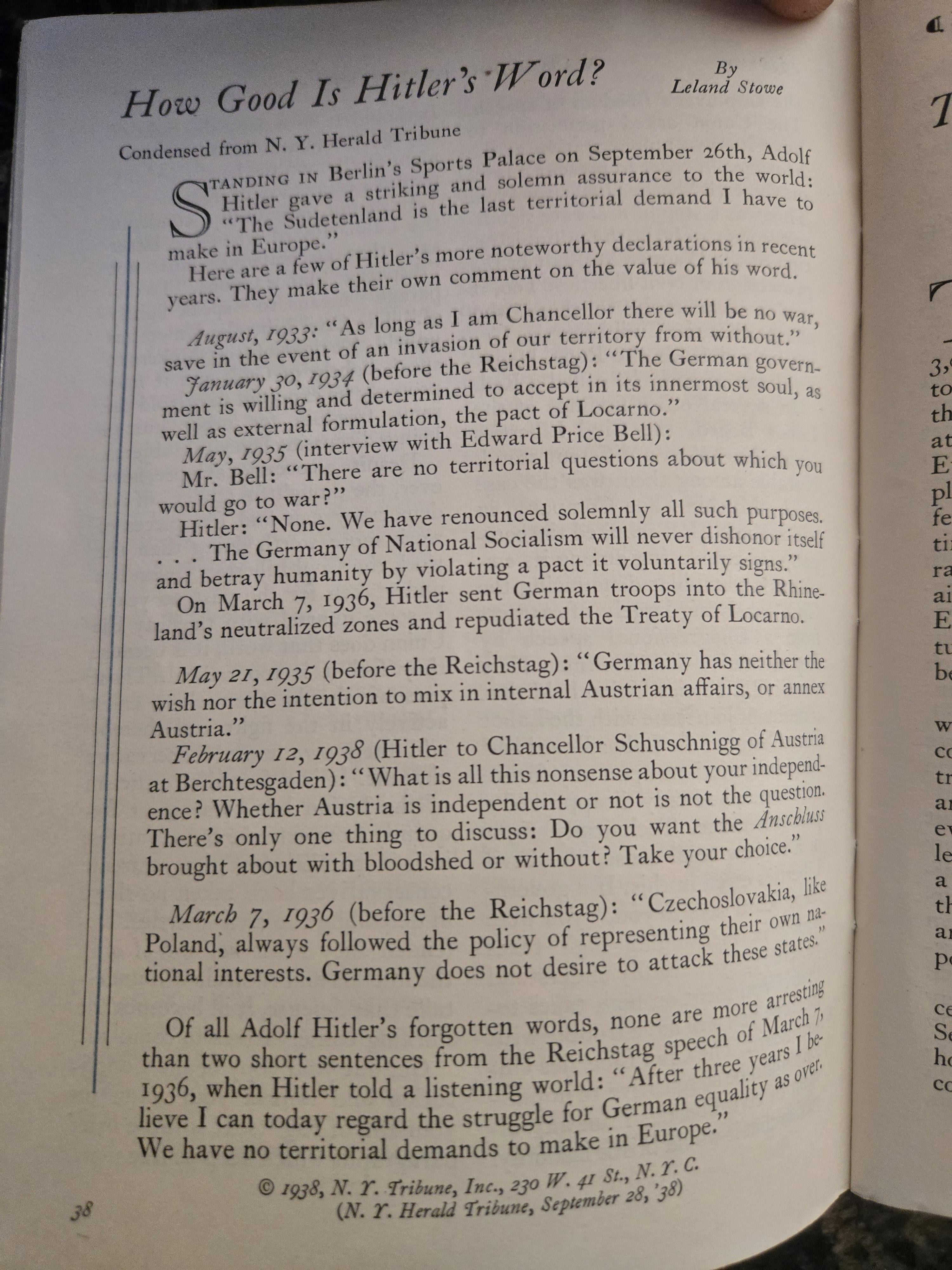 Article from 1938 discussing Hitlers [broken] promises. (Invaded Poland 9-1-1939)