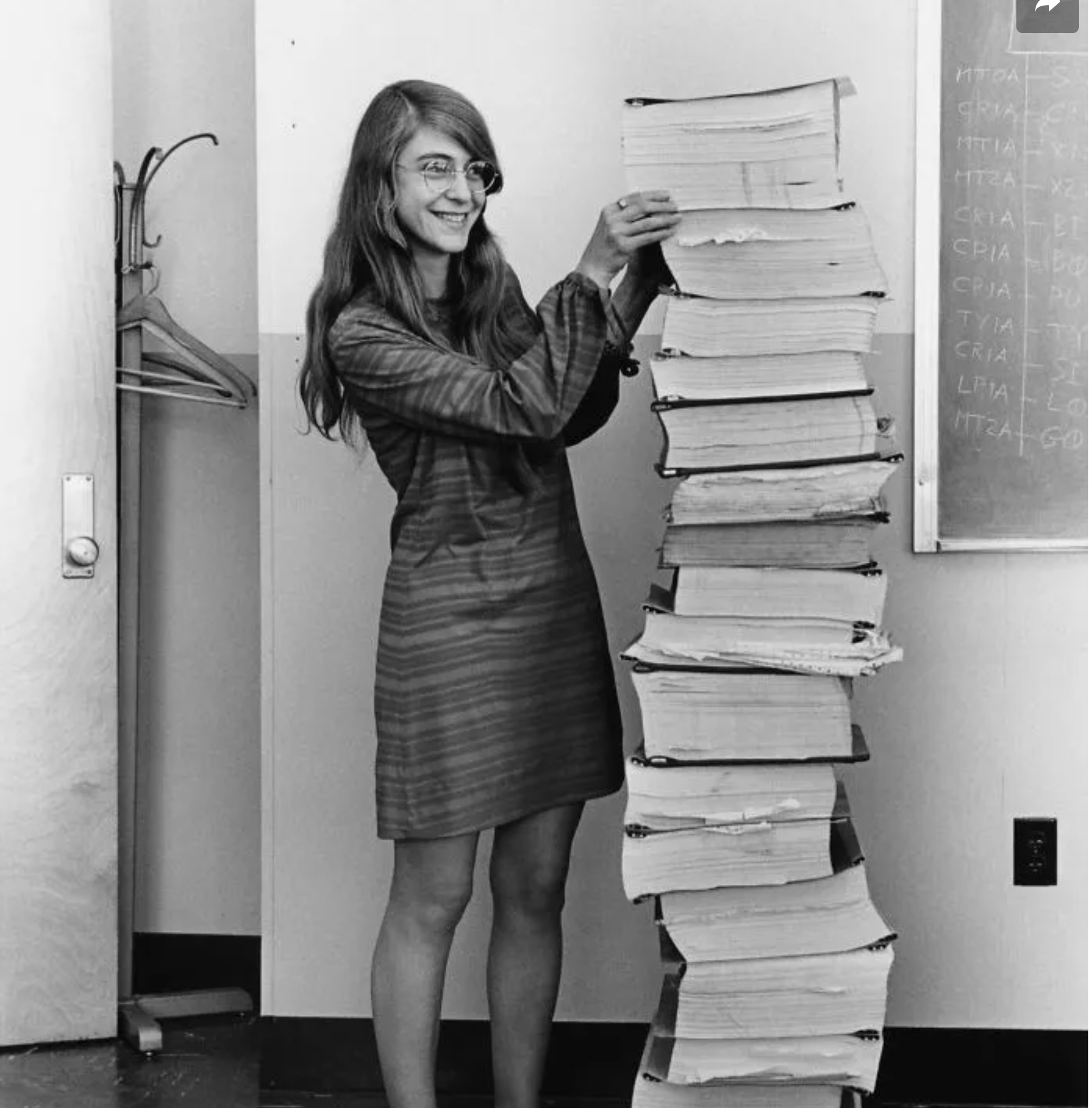 Margaret Hamilton with the handwritten navigation software she and her MIT Team produced for The Apollo Project, 1969