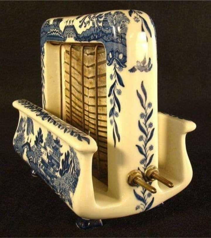 Early electric ceramic toaster from the late 1920s, made by Pan Electric in Ohio under the name “Toast-Rite”. The Blue Willow pattern is an English interpretation of a Chinese love legend. Estimated auction value: 1,000–2,000 USD depending on condition.
