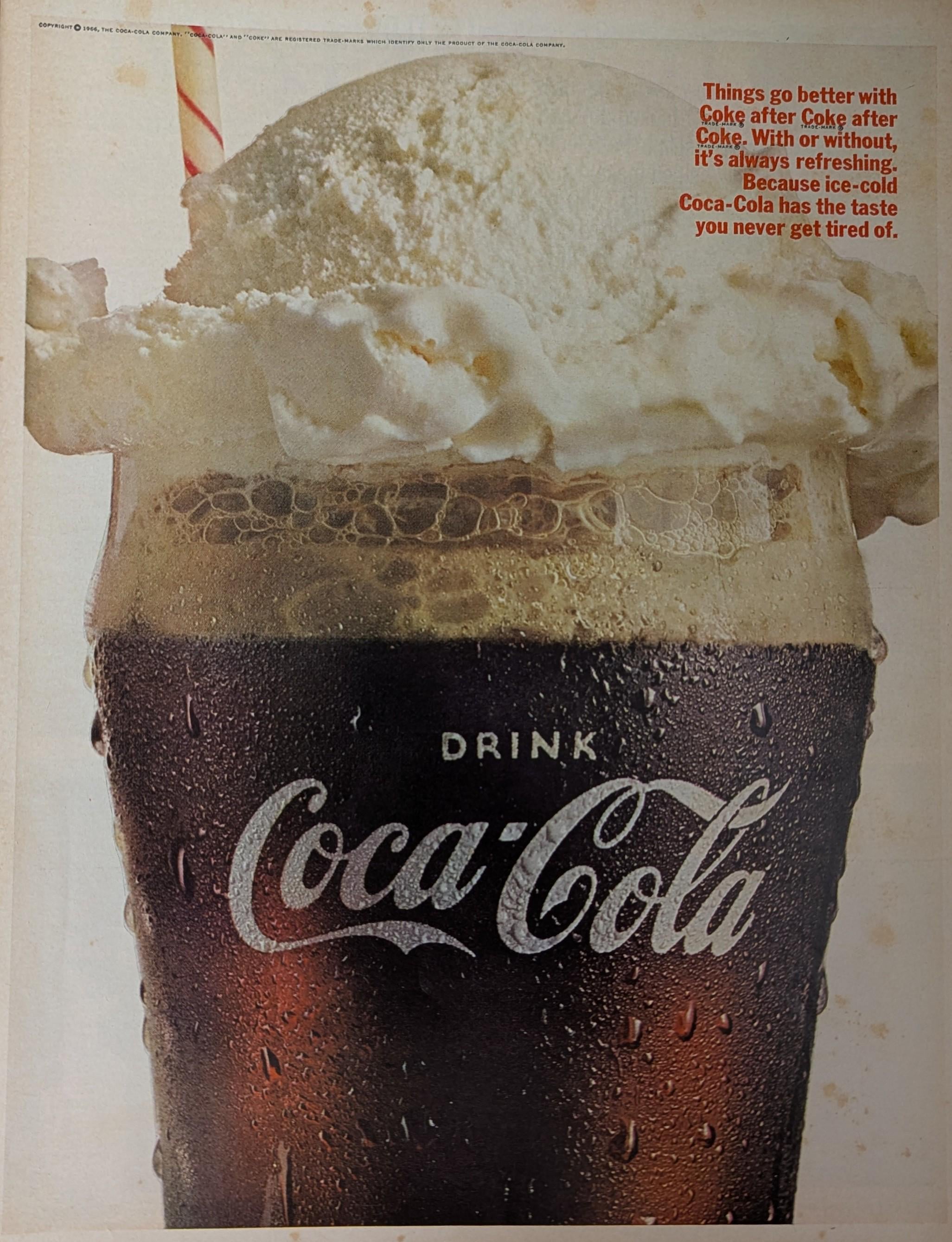 A crisp, simple, and deliciously effective piece of 1960s advertising. No celebrity. No lifestyle scene. Just ice-cold Coke, a scoop of vanilla ice cream, and one of the most famous slogans in ad history.
