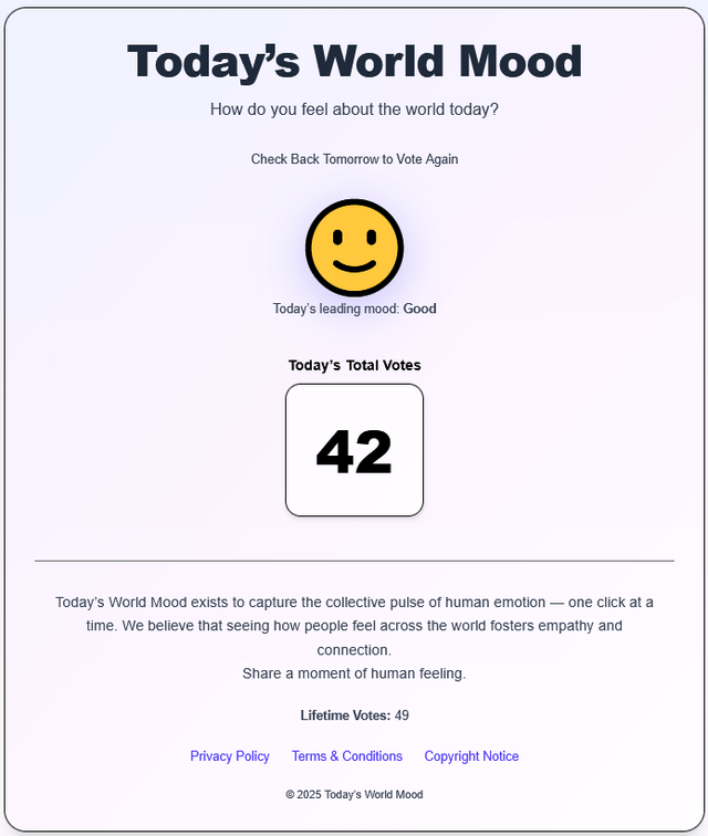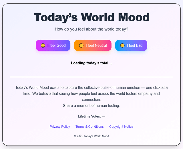 So I built a little project called Todayโs World Mood. Everyone gets one vote per day โ Good, Bad, or Neutral โ and the site updates in real time to show the planetโs overall mood. Unfortunately the data is limited for right now as this is just being deployed.