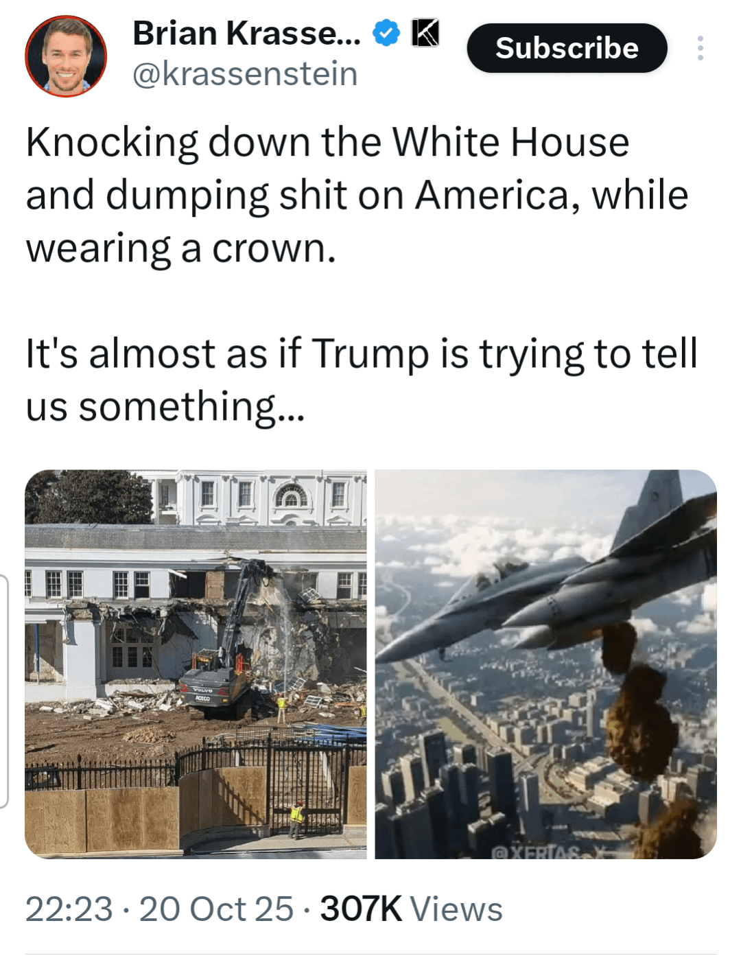 2. The White House remodel is bad enough, but why would the President post an AI video of himself dumping his entire cabinet out of a plane without parachutes? Just terrible!