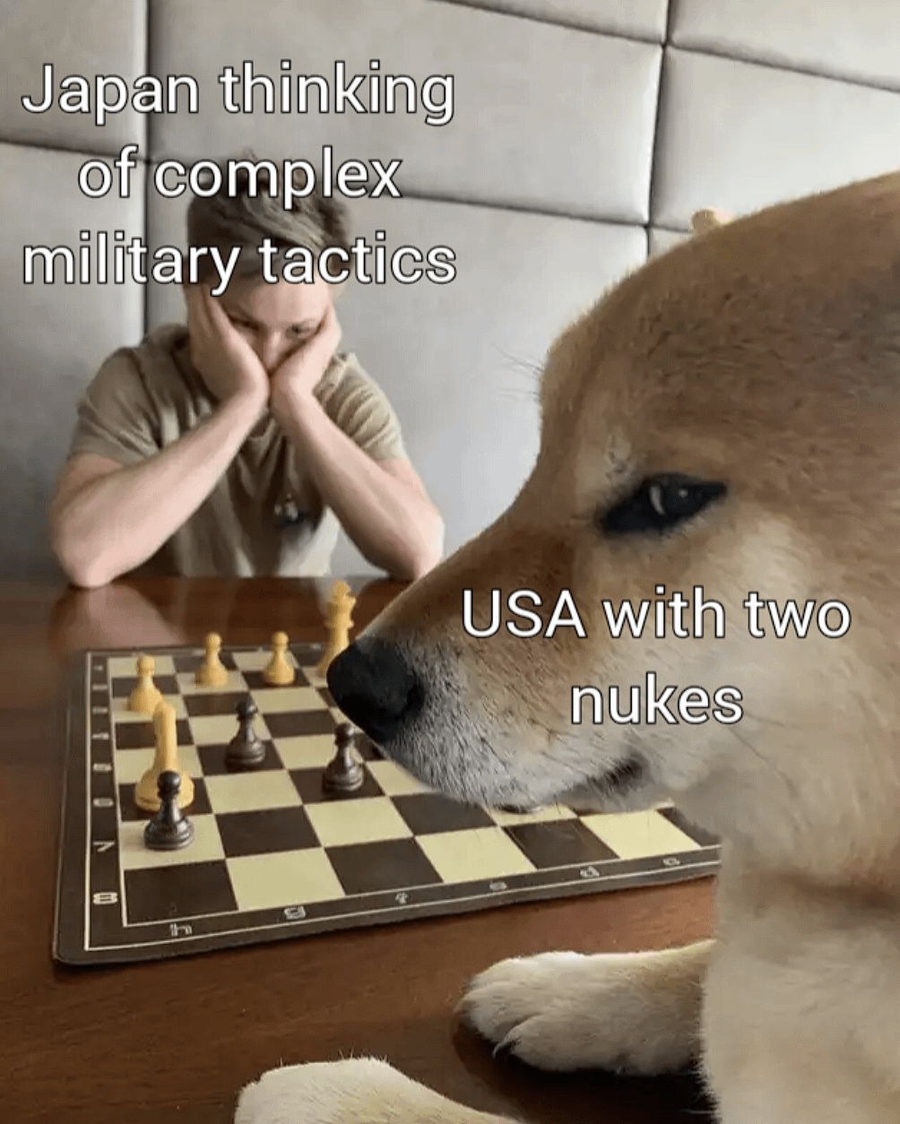 This meme completely invalidates all USN struggles and efforts 3 years prior to hold the line and eventually push back Imperial Japanese into the wall with “haha I got two nukes”.