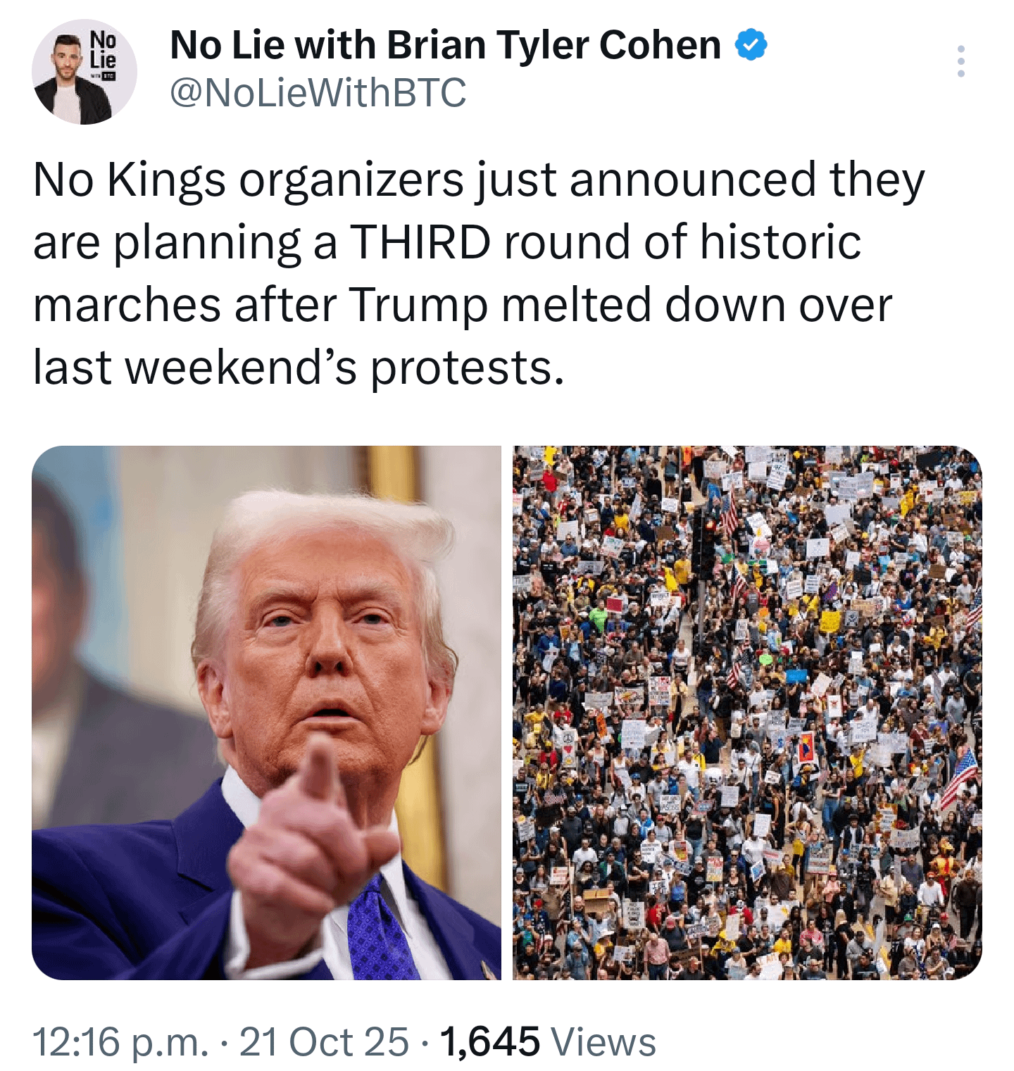 My little Central Valley town had 700 people attending “No Kings” this Saturday, last time it was 300. We were lining a busy street and the amount of people honking and waving was amazing! A few fingers and thumbs down from people but over all amazingly a joyful response from people passing us. That is in a small conservative town. We got this guys. We need to do another. Like soon! But I think we need to apply specific pressure now. Imagine focusing on the Epstein Files. Or getting rid of Stephen Miller. Opening our Government back up with the ACA credit returned and made permanent, impeaching the assholes in the Supreme Court. We have the hammer let’s pound some damn nails.