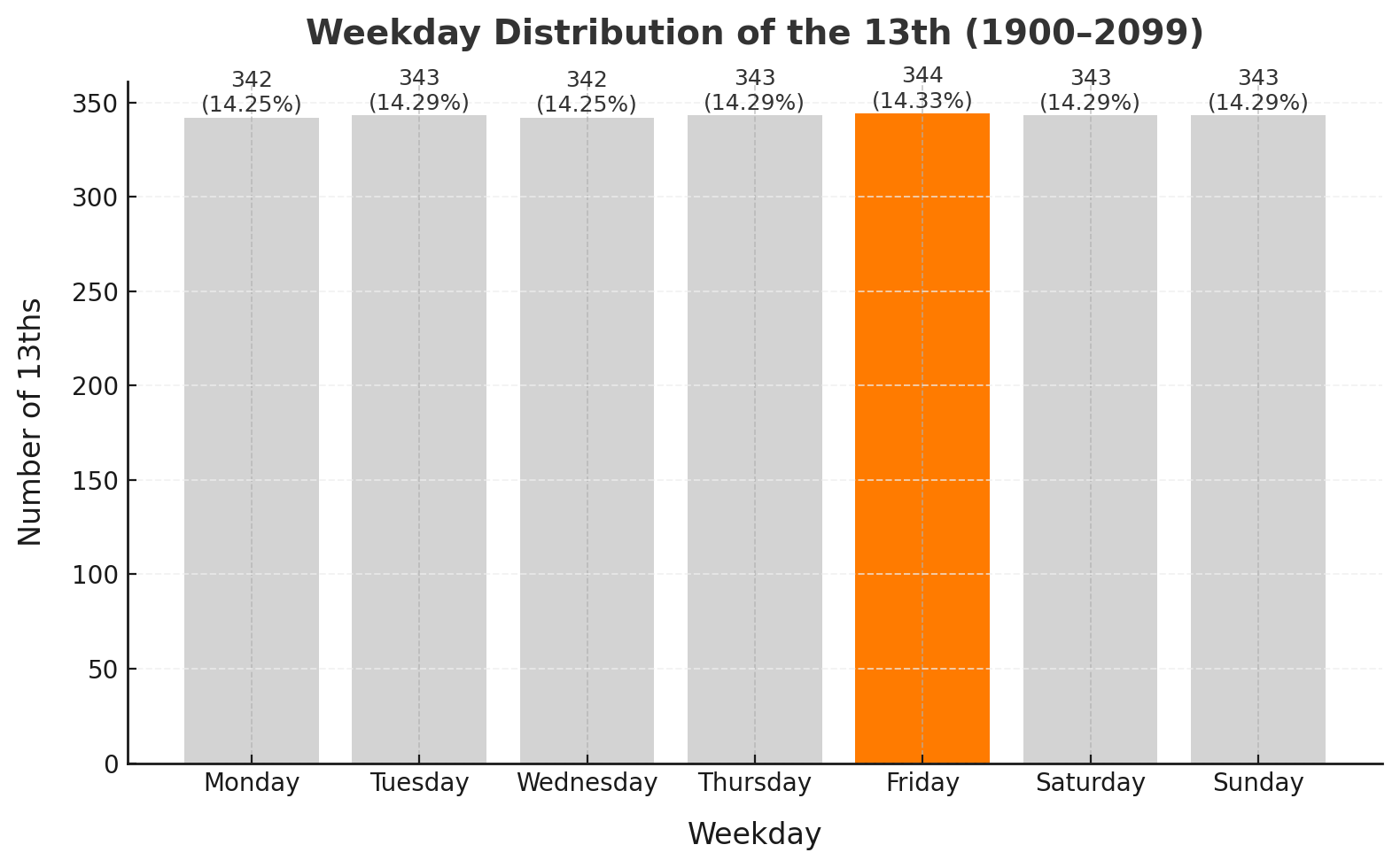 OC. I computed the weekday for every 13th of every month from 1900-2099 using the Gregorian calendar and plotted the distribution.