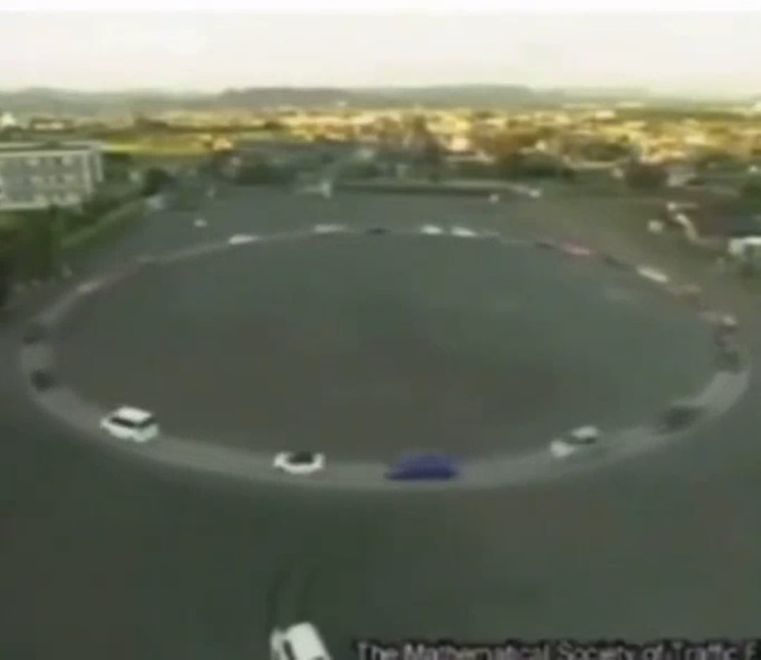 Hey guys, I am a traffic planner. As some others have already said, the reason for a traffic jam usually are drivers’ reactions to others. So braking when another one in front of you does or when you notice too late that the car in front of you is slower for example. And whenever you have others behind you that are forced to react to your action, a chain reaction happens and boom, traffic jam. So the ultimate reason is a combination of nobody driving perfectly and too much traffic overall. In this circle you see here, there is quite a big number of cars going round. Simply too many for that one lane circle road they are forming.