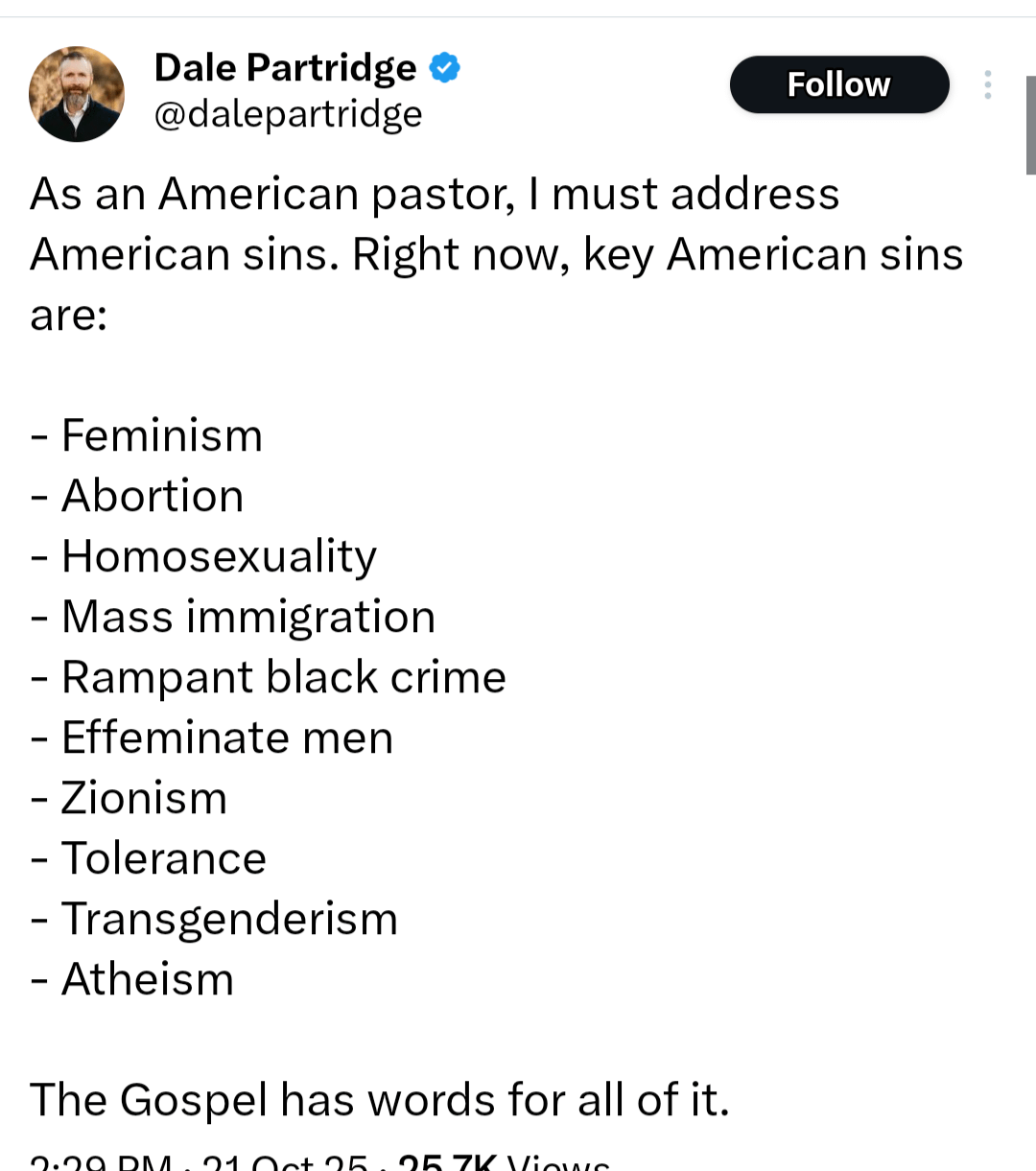 Funny how pedophilia escaped his list, but *tolerance*… oh, that’s a sin, all right.