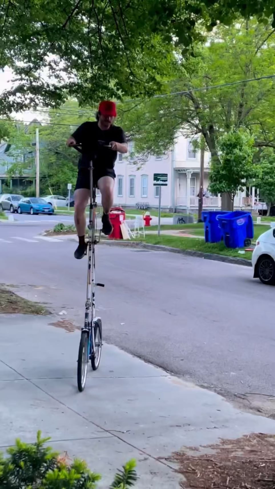 Looks like the sidewalk had a hump he was trying to go around and miscalculated how much momentum was required to make it around. At least he aimed for the bushes with his fall. Seriously though, of all the places to fall, he found a decent spot compared to concrete.