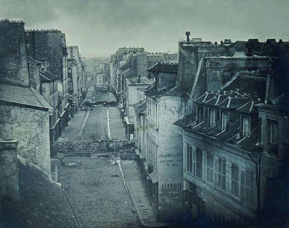 Photo of the barricades on the current rue du Faubourg-du-Temple in Paris during the June insurrection of the french revolution of 1848, taken by Charles-François Thibault on June 25, 1848 [1000×789]