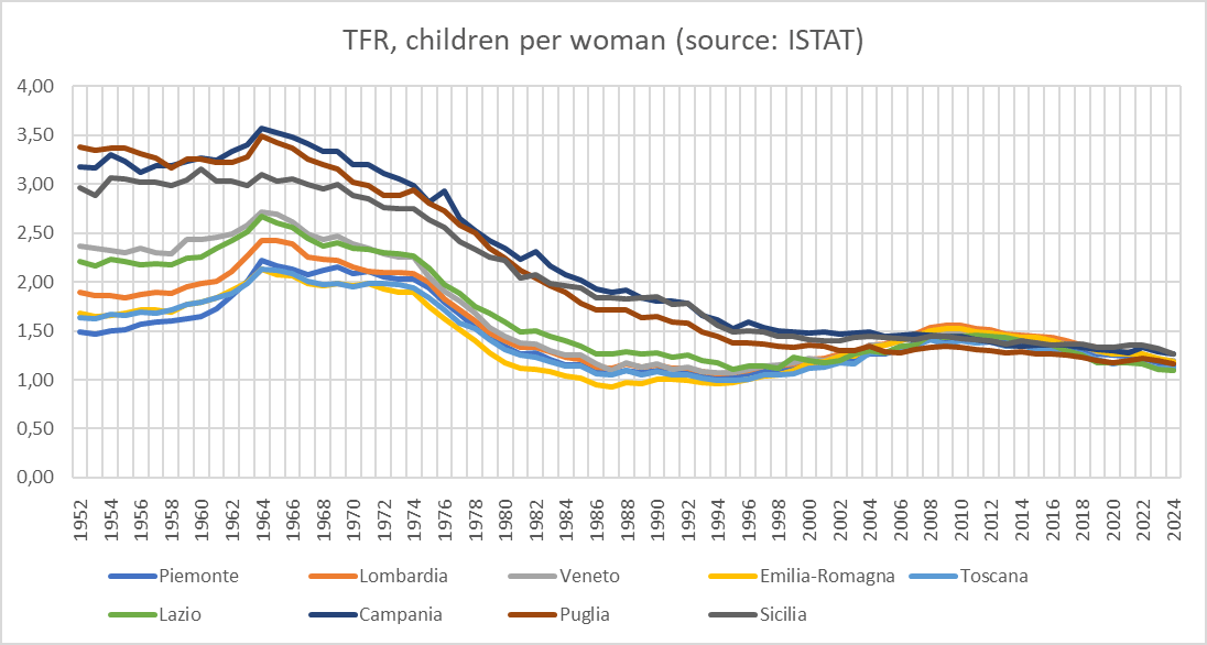 [OC] Fertility rate (children per woman) in Italy’s largest regions, 1952-2024